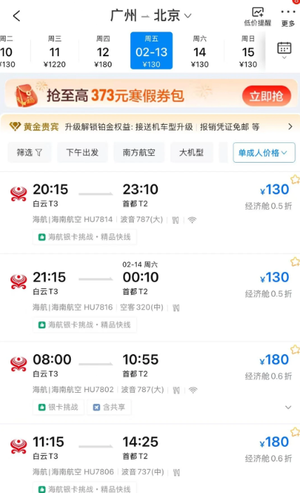 "我正好在做旅行计划,随手搜发现的,买到出票了,太开心了,第一次薅到大羊毛!"有网友称。还有网 友展示了出票成功的截图,1月17日从三亚凤凰机场前往乌鲁木齐天山机场,机票价格150元。"今天搜了 一下2月12—14号广州飞北京机票,不敢相信自己的眼睛,这么便宜,但是点进去就是购买不上,不一会 儿就180→240→490→800→1470了,比股票都涨得快!"有网友对此也是羡慕不已,称自己没能把握住"机 会"。"没蹭上,我以为是骗子,结果这么多人买到了,很难过,昨晚上刚买的正价票好几千!" 尽管有网友抢票成功,但还是担心这样的票"算不算数"。记者注意到,海南航空控股股份有限公司就在当 天发布了相关情况说明,并表示已售出的所有机票全部有效。 机票 扬子晚报网1月9日讯(记者 郭一鹏) "春节机票都飙到1500了,直接600拿下,感谢海航!"今天上午,有 多名网友反映,称海航部分航线出现低价bug票,并有人成功"捡漏"。 HU7721 · 宝安3号航站楼出发 已购/赠送服务 美食券,优惠券,省心出行服务 8 共享给好友 ¥610 "我司今日(2026年1月9日)上午10时左右,因系统临时故障,部分航线机票价格显示异 ...
