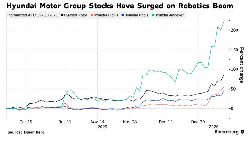智通财经APP获悉,总部位于韩国的全球汽车制造领军者现代汽车(Hyundai Motor Co.)的自2026年开年以来已足足增 加了约240亿美元的市值——相当于美国电动汽车新势力Rivian当前总市值,今年以来该公司在韩国股市的股价涨幅 更是高达30%,和韩国两大存储芯片巨头——三星电子与SK海力士共同成为推动韩国Kospi综合指数强劲延续2025 年疯涨76%之后的2026年开年迅猛涨势的核心贡献力量。 现代汽车当前的市场价值标签已经绝非一家单纯的汽车制造商,该公司集合"英伟达AI GPU系AI工厂"、自动驾驶技 术以及AI人形机器人这三大全球股市最热门投资主题于一身,这也是为何投资者们对于这家汽车制造商的看涨情绪 在近期持续升温。 在韩国股市周二交易时间段,现代汽车股价一度跃升超过10%,再度创下新的历史纪录,分析师们在该公司与"AI芯 片超级霸主"英伟达(NVDA.US)之间的合作愈发紧密,以及在上周CES全球科学技术展上展露出自动驾驶系统雄心壮 志,并且重磅揭幕Atlas人形机器人发布后纷纷大幅上调了价格目标。 在韩国股市,近日包括物流部门现代Glovis、零部件供应商现代Mobis和IT公司现代 ...