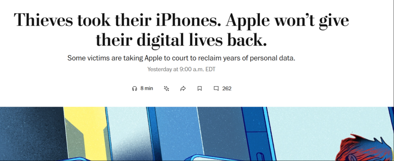 手机被盗即永失数字资产?苹果数据"黑洞"引众怒,遭索赔500万美元