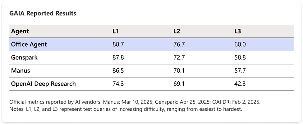 近日,微软正式推出 Office Agent —— 一个基于开源技术栈、Anthropic Claude 模型,并采用全新的"TDD-品味驱动开发(Taste-Driven Development)"范式构建的多智能体系统。Office Agent 的目标在于助力用户快速生成高质量内容,涵盖精致的 PowerPoint 演示文稿、可 直接使用的 Word 文档,以及即将推出的动态 Excel 表格。 Office Agent 通过多个专用智能体的协同合作,实现了从规划、撰写到完善的全流程自动化,全方位提升了 Office 内容生产效率。该系统 基于通用型智能体架构,已通过行业领先基准测试 GAIA 认证,性能卓越,在处理复杂工作流时兼具可靠性与精细度。 | Agent | L1 | L2 | г3 | | --- | --- | --- | --- | | Office Agent | 88.7 | 76.7 | 60.0 | | Genspark | 87.8 | 72.7 | 58.8 | | Manus | 86.5 | 70.1 | 57.7 | | OpenAl Deep Research | 74 ...