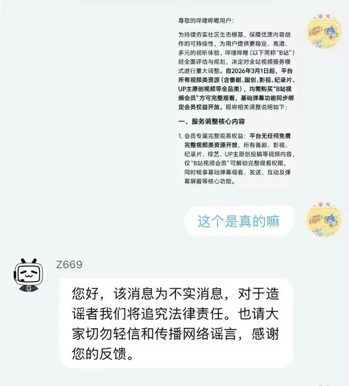 北京商报讯(记者 魏蔚)12月11日,一条有关哔哩哔哩(即"B站")会员权益的截图被风传。截图 称,"自2026年3月1日起,哔哩哔哩平台所有视频类资源均需购买B站视频会员方可完整观看,基础弹 幕功能同步绑定会员权益开放。"对此,B站有关人士表示,该消息为不实消息,对于造谣者我们将追 究法律责任。也请大家切勿轻信和传播网络谣言。 ...