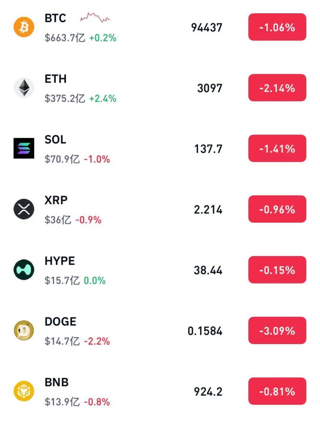 责编:刘安琪 | 审核:李震 | 监审:古筝 | BTC | 94437 | -1.06% | | --- | --- | --- | | $663.7亿 +0.2% | | | | ETH | 3097 | -2.14% | | $375.2亿 +2.4% | | | | SOL 三 | 137.7 | -1.41% | | $70.9亿 -1.0% | | | | XRP | | | | $36亿 -0.9% | 2.214 | -0.96% | | HYPE | | | | $15.7亿 0.0% | 38.44 | -0.15% | | DOGE | | | | $14.7亿 -2.2% | 0.1584 | -3.09% | | BNB | 924.2 | -0.81% | | $13.9亿 -0.8% | | | 【大河财立方消息】北京时间17日,在拉升至96600美元之后,比特币再度跳水,一度跌至93778.6美元,抹去今年以来所有涨幅。截至7时左右,比特币 跌超1%,跌破95000美元。多只加密货币产品跟跌。 ...