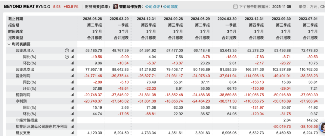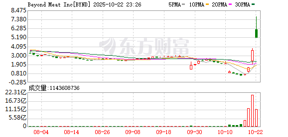 Core Insights - Beyond Meat's stock has surged over 600% in three trading days, triggering trading halts due to extreme volatility [1][3] - The recent spike in stock price is attributed to its inclusion in the Roundhill Meme ETF and a new partnership with Walmart [3][4] Stock Performance - On October 22, Beyond Meat's stock opened and experienced a trading halt, with an increase of over 90% at one point [1] - The stock's extreme volatility is partly due to over 63% of its float being shorted, leading to a short squeeze as prices rose [3] Business Developments - Beyond Meat announced a partnership with Walmart, which will be one of the first national retailers to offer the new Beyond Burger 6-pack [3][4] - The collaboration is expected to enhance distribution, entering mainstream retail channels and offering products in more than 2,000 Walmart stores [3][4] Strategic Advantages - The partnership with Walmart provides three key advantages: 1. Broader sales channels, moving from high-end stores to mass-market retail [4] 2. Increased product variety [4] 3. Introduction of economical packaging to improve price competitiveness [4] Financial Overview - Beyond Meat has faced ongoing financial challenges, with consistent quarterly losses since its IPO in May 2019 [4] - Recent financial data indicates a significant decline in revenue, with total revenue for the latest quarter reported at approximately 53.19 million [5]