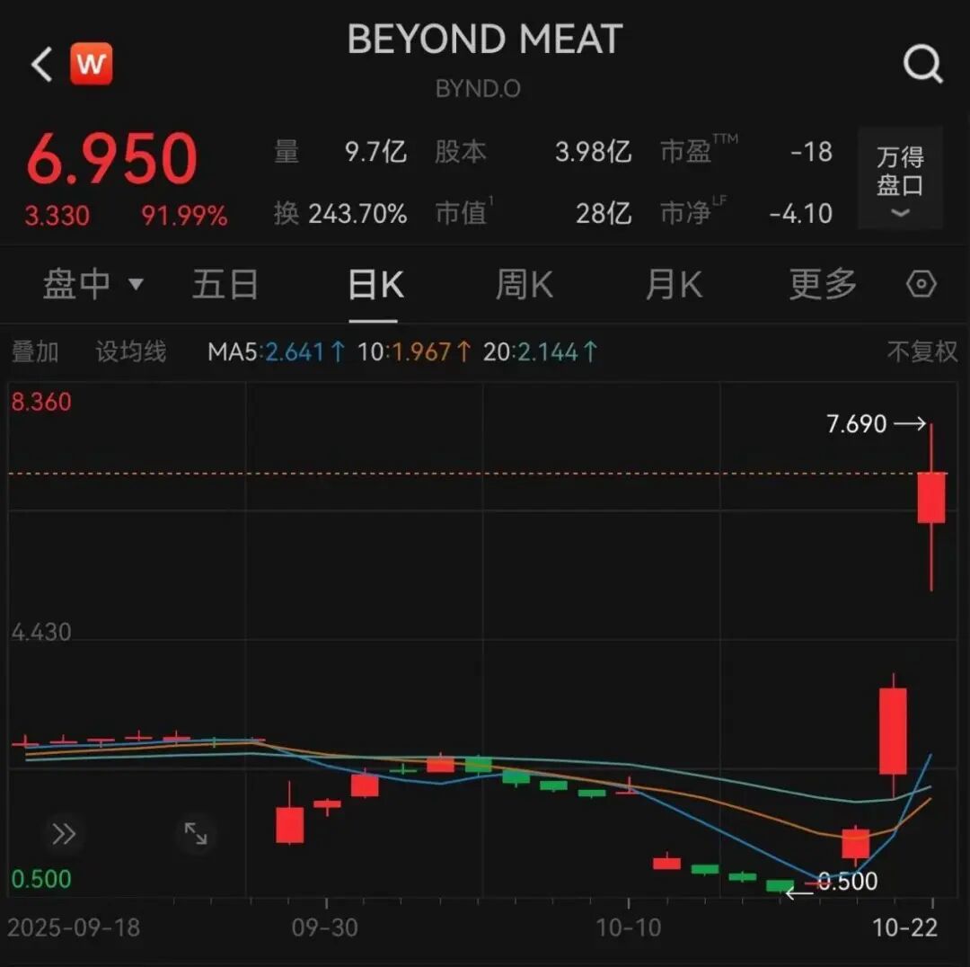 Core Viewpoint - The article discusses the recent dramatic surge in Beyond Meat's stock price, highlighting the factors driving this increase and the potential risks associated with it. Group 1: Stock Performance - Beyond Meat's stock price experienced a significant increase, soaring over 162% during intraday trading on October 21, with a closing increase of 146.26% [4]. - Over three trading days, the stock surged nearly 600%, and after hours, it rose by more than 24% [2]. - The stock had previously dropped to as low as $0.5, indicating a volatile trading history [10]. Group 2: Market Dynamics - The surge in Beyond Meat's stock price has forced short sellers to cover their positions, as over 63% of its float was sold short [3][8]. - The inclusion of Beyond Meat in Roundhill's meme stock ETF contributed to the stock's dramatic rise, reflecting a resurgence of retail investor interest [7][8]. - Analysts noted that the combination of low nominal stock price, high retail enthusiasm, and significant short interest can lead to a "short squeeze" scenario [9]. Group 3: Company Challenges - Despite the stock's recent performance, Beyond Meat faces substantial operational challenges, with a reported earnings per share of -$2.14 and ongoing financial difficulties [9]. - The company has struggled since its IPO in 2019, with stock performance showing negative returns over five consecutive years [10]. - Analysts warn that the current speculative trading behavior may indicate a potential market bubble, as investors continue to flock to high-risk stocks despite poor fundamentals [9]. Group 4: Broader Market Context - The article also mentions the overall performance of the U.S. stock market, with the Dow Jones reaching a historical high, supported by strong earnings reports from major companies [11]. - Approximately 86% of companies have reported earnings exceeding expectations, suggesting a positive outlook for the upcoming earnings season [12]. - The volatility in gold and silver prices, along with mixed performances from major tech stocks, reflects broader market dynamics that could influence investor sentiment [12].
