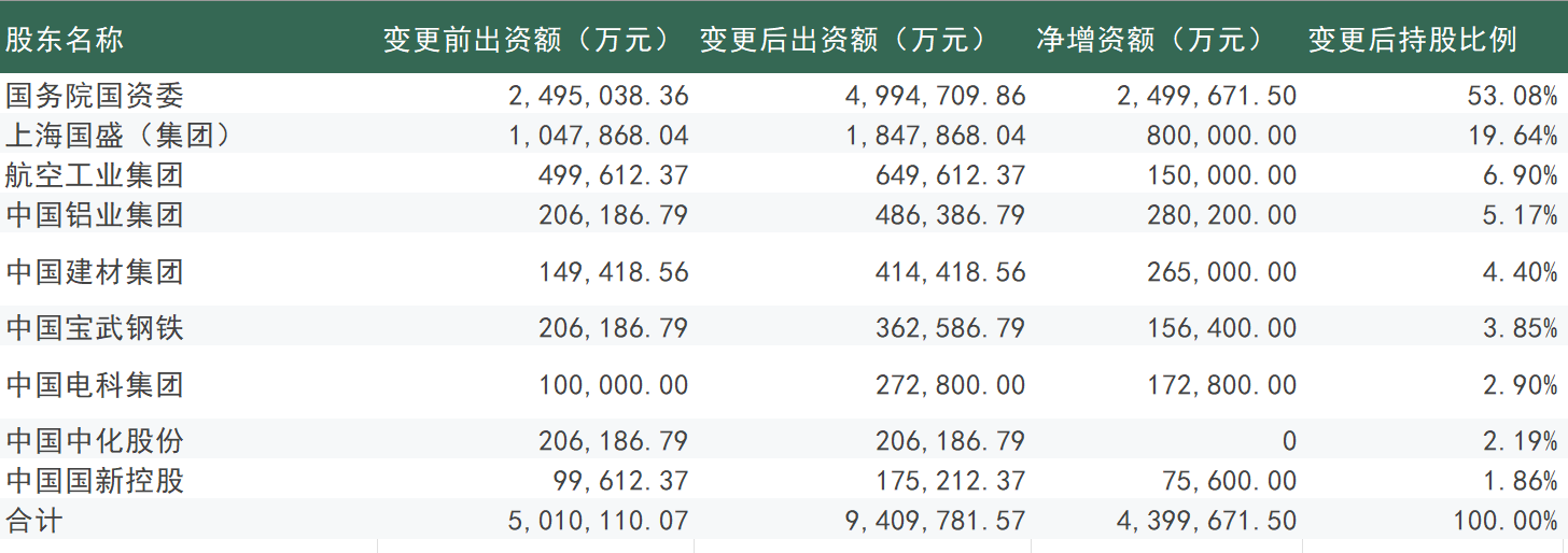国产大飞机C919进入规模化交付的关键节点,其制造主体获得了成立以来最大规模的资本加持。 国家企业信用信息公示系统显示,中国商用飞机有限责任公司(下称"中国商飞")近日发生工商变更,注册资本由约501.01亿元人民币大幅增至约940.98亿 元人民币,增幅约88%。 | 股东名称 | 变更前出资额(万元) 变更后出资额(万元) | | 净增资额 | | --- | --- | --- | --- | | 国务院国资委 | 2, 495, 038. 36 | 4. 994. 709. 86 | 2, 49 | | 上海国盛(美团) | 1. 047. 868. 04 | 1. 847. 868. 04 | 801 | | 航空工业集团 | 499. 612. 37 | 649, 612. 37 | 151 | | 中国铝业集团 | 206. 186. 79 | 486, 386. 79 | 281 | | 中国建材集团 | 149. 418. 56 | 414. 418. 56 | 26! | | 中国宝武钢铁 | 206. 186. 79 | 362, 586. 79 | 15 | | 中国电科集团 | 10 ...