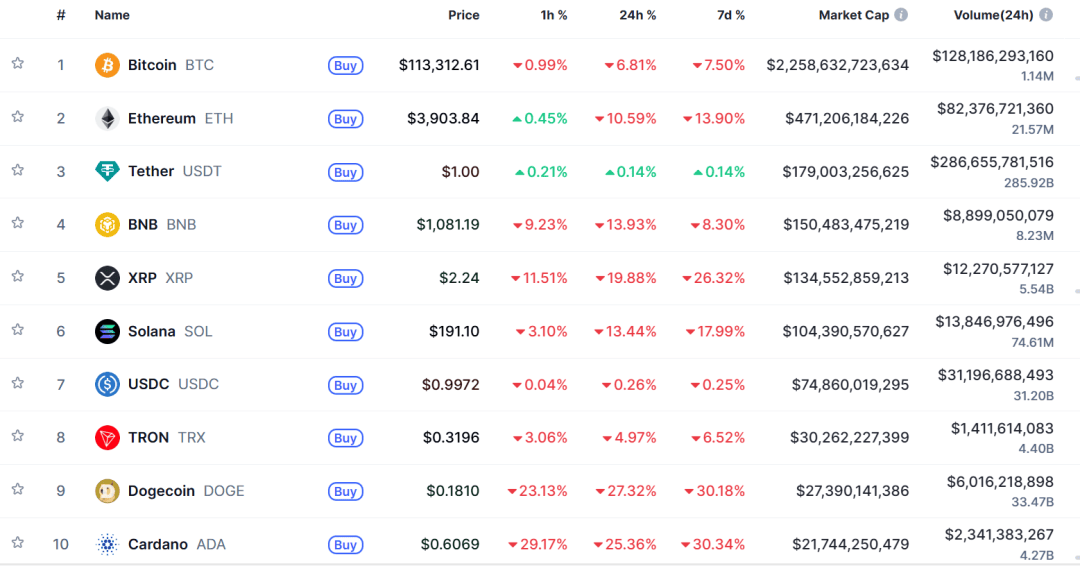 CME以太币期货DCR主力合约周五重挫11.29%,报3879美元,本周累计下跌14.80%,周五美股盘后一度跌至3500美元,周二至周五呈持续走低态势。 有业内人士指出,市场的不确定性导致风险资产暴跌,衍生品市场对下行保护需求激增。期权市场动态可能比以往任何时候都更能影响基础市场的价格走 势。 | | # | Name | | Price | 1h % | 24h % | 7d % | Market Cap 0 | Volume(24h) 0 | | --- | --- | --- | --- | --- | --- | --- | --- | --- | --- | | ಭ | 1 | B Bitcoin BTC | (Buy | $113,312.61 | -0.99% | -6.81% | ▼7.50% | $2,258,632,723,634 | $128,186,293,160 | | | | | | | | | | | 1.14M | | ಭಿ | 2 | Ethereum ETH | (Buy) | $3,903.84 | △0.45% | - 10.59% | - 13.90% | $471 ...