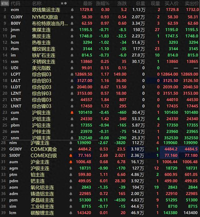 来源:上海有色网 金属市场: 截至日间收盘,内盘基本金属普跌,仅沪铝唯一上涨,涨幅达1.42%。沪镍以2.67%的跌幅领跌,其余 金属跌幅均在1%以内。氧化铝主连跌1.35%,铸造铝主连涨0.72%。 此外,碳酸锂主连涨0.01%,工业硅主连跌0.17%,多晶硅主连继续下挫,跌8.11%。欧线集运主连涨 0.3%报1729.8。 黑色系方面多飘绿,不锈钢涨0.25%,螺纹、热卷一同跌超1%,螺纹跌1.1%,热卷跌1.02%。双焦方 面,焦煤跌0.71%,焦炭跌1.83%。 外盘方面,截至15:03分,外盘基本金属集体上涨,伦锡涨1.84%,伦镍涨1.72%,伦铜涨1.17%,伦铝 涨1.16%。其余金属涨幅均在1%以内。 贵金属方面,截至15:03分,COMEX黄金涨0.53%,COMEX白银涨2.69%。国内方面,沪金涨0.68%, 沪银跌0.9%。 此外,铂主连涨1.11%,钯主连涨6.01%。 | 初始 代码 | | 名称 | ●求 | 腰折 | 沃幅% | 涨跌 | 总量 | 现量 | 买入价 | 美出价 | | --- | --- | --- | --- | --- | --- | --- | -- ...