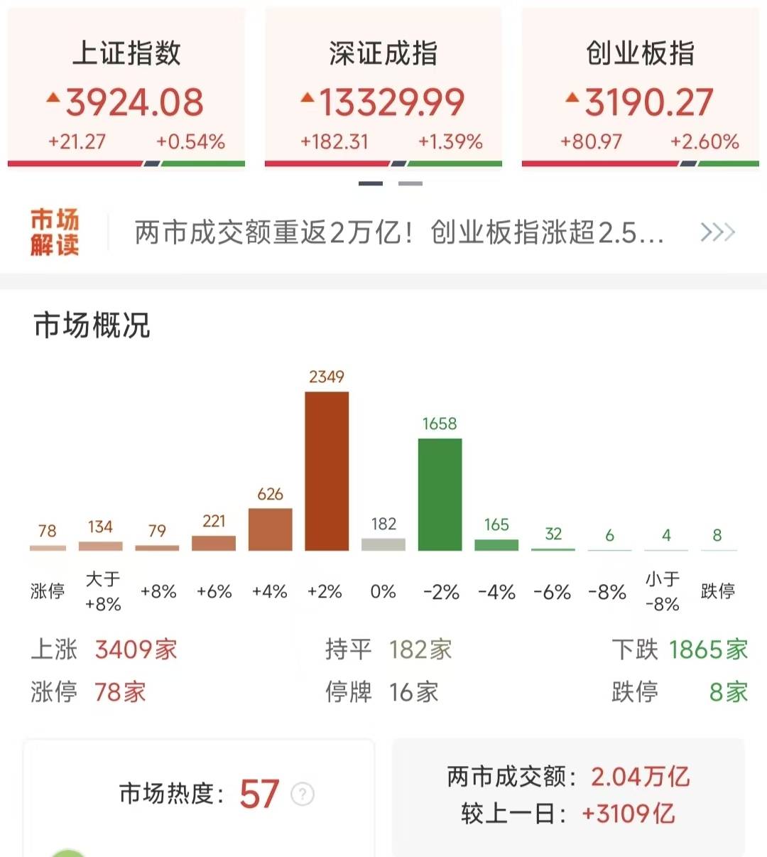 今天,沉寂一段时间的A股再度迎来爆发。两市交易量在时隔20个交易日后,重新站上2万亿元高峰,当日成交额达2.05万亿元,比前一个交易日放量3000 多亿元,一扫市场持续缩量的阴霾。 三大股指呈现高开高走的强势格局,截至收盘,沪指报3924.08点,涨0.54%;深成指涨1.39%,创业板指放量大涨2.6%。全市场3400多家公司上涨,78只 个股涨停,赚钱效应回升。 从板块来看,科技赛道继续领跑全场,多只CPO概念股创历史新高;素有"牛市旗手"之称的券商股同步崛起,个股集体走强。这种市场格局折射出乐观情 绪的全面升温,究竟发生了什么? 科技、券商等板块爆发 今天,科技板块表现亮眼,CPO概念股全线上扬,涨幅5.36%。其中,龙头股东田微20%涨停,天孚通信一度20%涨停,源杰科技、景旺电子涨10%,长 光华芯、仕佳光子、中际旭创、新易盛、胜宏科技等均大涨,多只个股创股价历史新高。此外,AI算力、半导体等科技细分赛道也同步走强,形成板块 联动效应。 | 涨幅榜 | 跌幅榜 | 量比 | 换手率 成交额 | | --- | --- | --- | --- | | 东田微 | | 164.14 | +20.00% ...