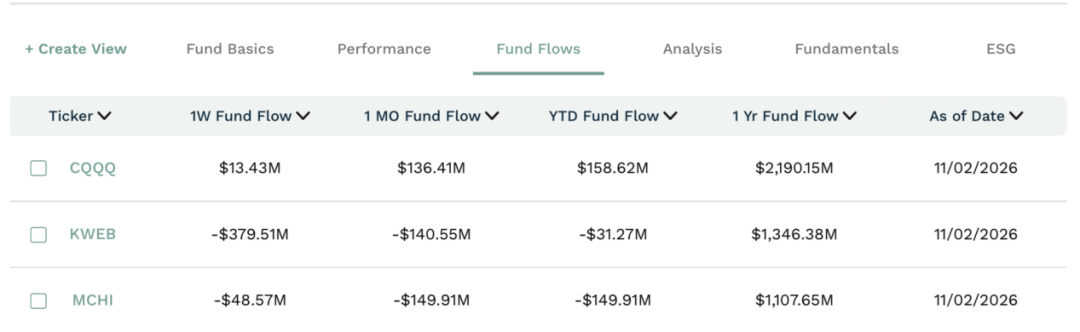 【导读】1月美国和欧盟区公募基金净流入中国90亿美元 过去一年,在美国上市的中国股票ETF中3只吸金超过10亿美元。其中,CQQQ吸金21.90亿美元;同期,KWEB吸金13.46亿美元,MCHI吸金11.08亿美 元。吸金最多的CQQQ聚焦中国科技公司。 | + Create View | | Fund Basics | Performance | Fund Flows | | Analysis | | Fundamentals | ESG | | --- | --- | --- | --- | --- | --- | --- | --- | --- | --- | | Ticker V | | 1W Fund Flow V | 1 MO Fund Flow V | | YTD Fund Flow V | | 1 Yr Fund Flow V | | As of Date V | | | CQQQ | $13.43M | $136.41M | | $158.62M | | $2,190.15M | | 11/02/2026 | | | KWEB | -$379.51M | -$140.55M | | -$3 ...