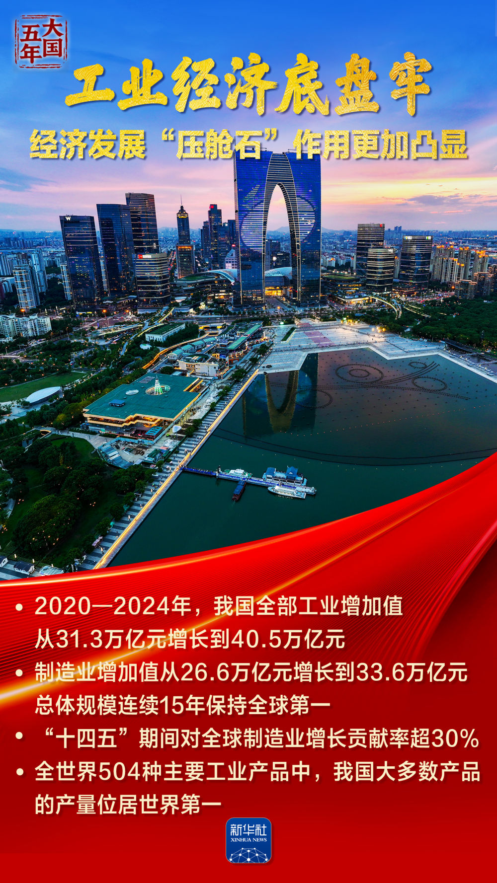 让我们跟随这组海报,一起领略中国实体经济的实力硬核,感受新质生产力的蓬勃脉动,见证大国实业在新时代书写稳中有进、质效兼优 的奋进答卷。 知古斯 l 實業成; 标示它可新成果加速涌现 工业经济底盘稳固,制造业增加值突破33万亿元;大国重器闪亮登场,创新成果璀璨夺目;数字化转型全面提速,智能工厂遍地开花…… 过去五年,我国实体经济不断巩固壮大,为高质量发展与强国建设筑牢"压舱石"。 制造业增加值从26.6万亿元增长到33.6万亿元 总体规模连续15年保持全球第一 "十四五"期间对全球制造业增长贡献率超30% · 全世界504种主要工业产品中,我国大多数产品 的产量位居世界第一 · 规上制造业企业研发经费占营业收入比重超过1.6% · 570多家工业企业入围全球研发投入2500强 "嫦娥"落月、"天和"驻空、北斗"组网 C919大飞机实现商飞,"爱达·魔都号" 大型邮轮建成运营, CR450动车组成功下线 体外膜肺氧合机(ECMO)填补了国内空白 凯指如 产业发展指出 "数字湖幣"。 KA 凯华版 Phone Shi 信质量发展不断取得新加效 · 我国建成了全球最大、覆盖最广的网络基础设施 5G基站达到459.8万 ...