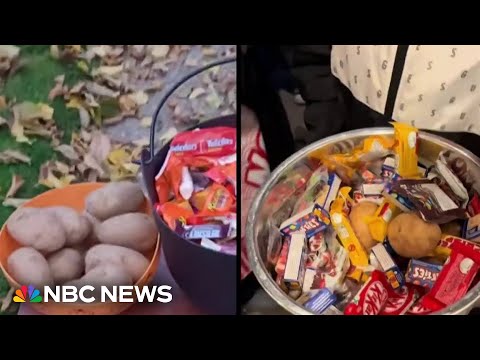 Every Halloween, kids in costume fill their baskets with a smorgus board of sweets. But there's a new star of the spooky season. >> Pick whatever you want.>> You can grab two. >> That is kids saying trick or tater. >> Did you just get a potato.>> Yes. >> Videos of homeowners handing out potatoes on Halloween have been sprouting up on social media in recent years, leaving some puzzled, but surprisingly most ecstatic. >> YOU WANT MORE POTATOES. WHO WANTS MORE POTATOES.>> Candy or a potato. >> Potato. >> Pat B ...