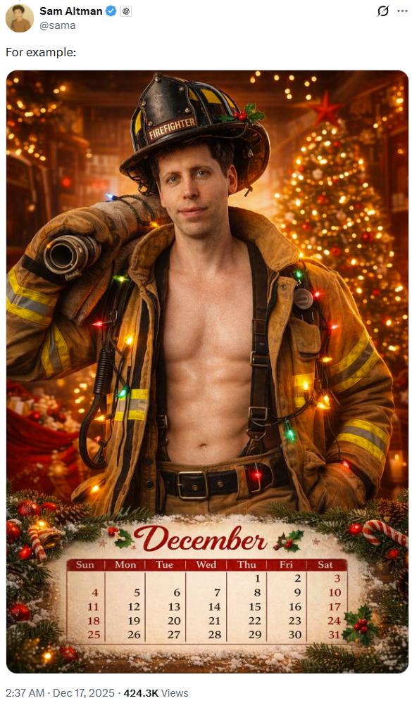 如果你刚刚打开 X 并且正好关注了 OpenAI 和山姆・奥特曼,那么你可能会看到这样的照片: 是的,确实有点辣眼睛。就连 OpenAI 官方号也忍不住吐槽(其实是刷热度):sam. 而在评论区,更是一片吐槽和调侃: | Ravi Karkara @ @ravikarkara · 3h | | | | | | --- | --- | --- | --- | --- | | @chat December 2025 started on a Monday @ | | | | | | () | 17 | 01 | 111 3.3K | T. | | toki @ @tokihossain · 2h | | | | | | agi achieved | | | | | | C | 17 | C3 | 1 2.7K | T, | 但不管怎么说,热度是有了。 实际上,山姆・奥特曼之所以发这样一张辣眼睛的图片,正是为 OpenAI 刚刚推出的全新ChatGPT Images造势。而且这也不是唯一一张基于奥特曼照片 改的图。OpenAI 官方号还专门单独特地发了一张这样的: 而且以身入局的 OpenAI 大佬还不止他一个。O ...