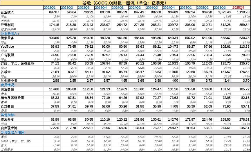 Core Viewpoint - Alphabet, Google's parent company, reported Q4 2025 earnings with total revenue of $113.83 billion, an 18% year-over-year increase, and operating profit of $35.93 billion, slightly exceeding expectations [1] Financial Performance - Total revenue for Q4 2025 reached $113.83 billion, up from $96.43 billion in Q4 2024, reflecting an 18% growth [1] - Operating profit was $35.93 billion, with diluted earnings per share at $2.82, surpassing market expectations [1] - The revenue breakdown shows strong performance in various segments, particularly in advertising and cloud services [1][4] Business Segments - **Advertising Revenue**: Search advertising revenue was $63.07 billion, growing 16.7% year-over-year, driven by a robust retail sector [6][8] - **YouTube**: Generated $11.4 billion in revenue, with growth slowing to 8.7% due to high comparative figures from the previous year [15] - **Cloud Services**: Google Cloud revenue reached $17.7 billion, continuing its strong performance, with a profit margin exceeding 30% [10][14] - **Subscription Services**: Revenue from subscription services was $13.6 billion, growing 16.7% year-over-year, with Google One showing significant potential for future growth [16][18] Capital Expenditure and R&D - Capital expenditures for Q4 were $27.85 billion, a 95% increase year-over-year, with full-year capital expenditures nearing $91.5 billion [23][26] - R&D expenses reached $18.6 billion, with a rate exceeding 16% of revenue, indicating a strong commitment to innovation [20][22] Strategic Insights - The company is focusing on AI capabilities, particularly with the Gemini model, which has shown strong user growth and engagement [9][19] - Management has indicated a doubling of capital expenditure guidance for 2026 to $175-185 billion, reflecting confidence in AI infrastructure and market demand [26][27] - The strategic emphasis on AI and cloud services positions Google favorably against competitors, potentially leading to increased market share and profitability [27]