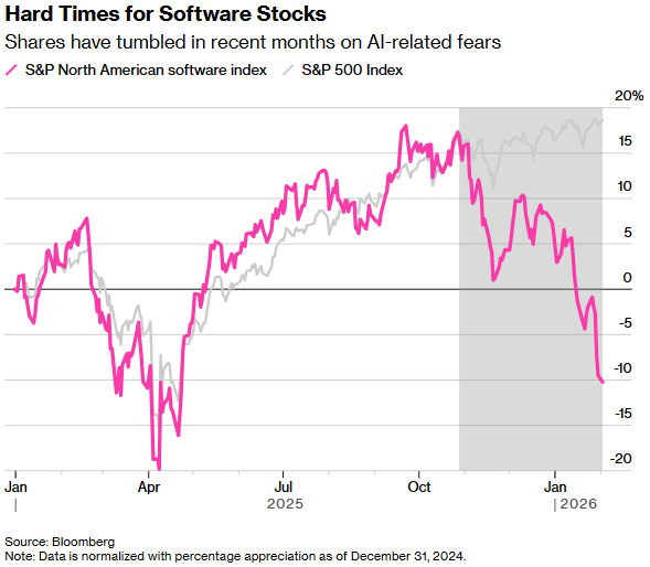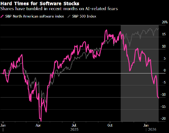 智通财经APP获悉,华尔街对软件股的质疑已持续一段时间,但近期市场情绪已从看跌恶化至"末日状 态"——交易员正全面抛售该行业股票,对人工智能颠覆性冲击的担忧持续堆积。 "我们称之为'SaaS末日'(SaaSpocalypse),即软件服务类股票的劫难," 杰富瑞股票交易台的Jeffrey Favuzza表示,"当前交易完全是'不计代价抛售'的模式。" 担忧情绪也在私募股权领域蔓延。据知情人士透露,包括Arcmont资产管理公司和Hayfin资本管理公司 在内的机构已聘请顾问审查其投资组合,以识别可能面临冲击的业务。阿波罗全球管理公司将其直接贷 款基金对软件的敞口在2025年几乎削减了一半,从年初的约20%大幅下调。 在美股上市公司中,根据数据,本财报季迄今,标普500指数中仅67%的软件公司营收超出预期,远低 于科技板块整体83%的超预期比例。尽管所有软件股的盈利均超预期,但在市场对长期前景的忧虑面 前,这已无足轻重。 例如,微软上周公布的业绩表现稳健,但投资者对其云销售增长放缓的关注,引发了对其巨额AI支出 的新一轮审视,导致其股价上周四大跌10%。1月成为微软股票十余年来表现最差的月份。与此同时, Ser ...