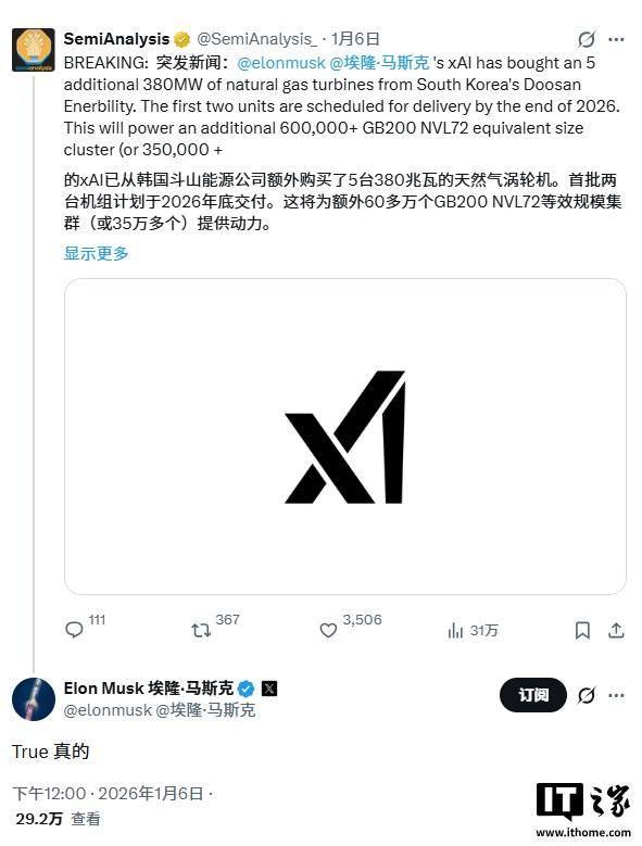 IT之家 1 月 7 日消息,埃隆・马斯克旗下的人工智能初创企业 xAI,又从韩国斗山能源公司额外采购了 5 台 380 兆瓦的燃气轮机,用于为其持续扩容的超级计算机集群供电。 xAI 采购新涡轮机的消息由社交平台 X 的用户 @SemiAnalysis 率先披露,该用户指出这批涡轮机由韩 国斗山能源公司生产。据《亚洲经济日报》报道,斗山能源去年 10 月曾宣布,与美国一家大型科技企 业签订合同,为其供应 2 台 380 兆瓦燃气轮机。同年 12 月,斗山能源进一步透露,又斩获了 3 台同型 号燃气轮机的订单。 上述 X 平台用户称,这批燃气轮机将为一个新增的、规模相当于 60 多万台 GB200 NVL72 芯片的计算 集群提供电力支持。这或将使 xAI 的数据中心跻身全球最大规模之列。埃隆・马斯克在回复相关帖子 时证实了采购事宜,他在 X 平台发文称:"情况属实。" 近期 xAI 顺利完成了一轮超额认购的 E 轮融资,融资金额达 200 亿美元(IT之家注:现汇率约合 1399.06 亿元人民币),超出了最初 150 亿美元的目标,这笔资金将用于推动基础设施的快速扩建以及 人工智能产品的研发。这家人工智能 ...