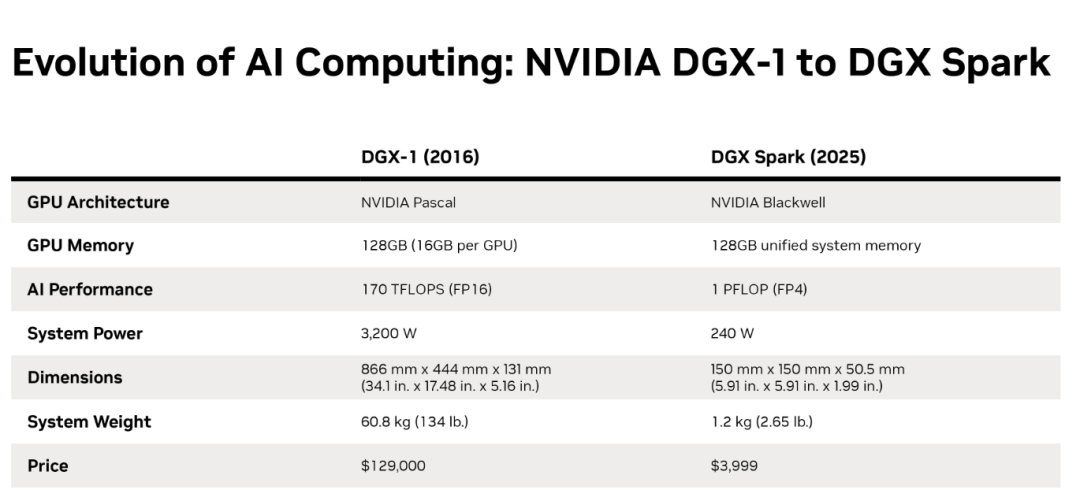 Core Insights - NVIDIA has introduced the DGX Spark, a compact AI supercomputer designed for personal use, which is significantly smaller and more affordable than traditional data center models [2][5][21] - The DGX Spark is positioned as a solution to the rising costs of cloud computing for AI applications, allowing users to run models locally without incurring high cloud fees [22][23] Product Specifications - The DGX Spark features NVIDIA's Blackwell architecture, 128GB unified system memory, and delivers 1 PFLOP of AI performance, while consuming only 240 W of power [1] - In contrast, the previous DGX-1 model utilized the Pascal architecture, had 128GB of GPU memory, and required 3,200 W of power, highlighting the advancements in efficiency and performance [1] Market Context - The introduction of DGX Spark reflects a shift in the AI landscape from cloud-based solutions to local computing, driven by increasing cloud costs and the need for real-time processing capabilities [22][24] - Companies are increasingly looking to establish local GPU nodes to reduce costs and enhance compliance, marking a return to desktop computing as a viable option for AI workloads [24][26] Testing and Performance - Initial tests by LMSYS indicate that DGX Spark performs well with mid-sized models (8B-20B parameters), outperforming similarly priced standalone GPU platforms [10][21] - The device can operate as a local AI node, providing API services similar to cloud-based solutions, thus enabling a complete local AI development environment [11][16][21] Industry Implications - The launch of DGX Spark signifies a potential revolution in how AI capabilities are deployed, allowing developers to maintain control over their computing resources and model deployment [22][26] - As AI applications evolve to require real-time interaction, the need for local processing power is becoming increasingly critical, positioning products like DGX Spark favorably in the market [25][26]