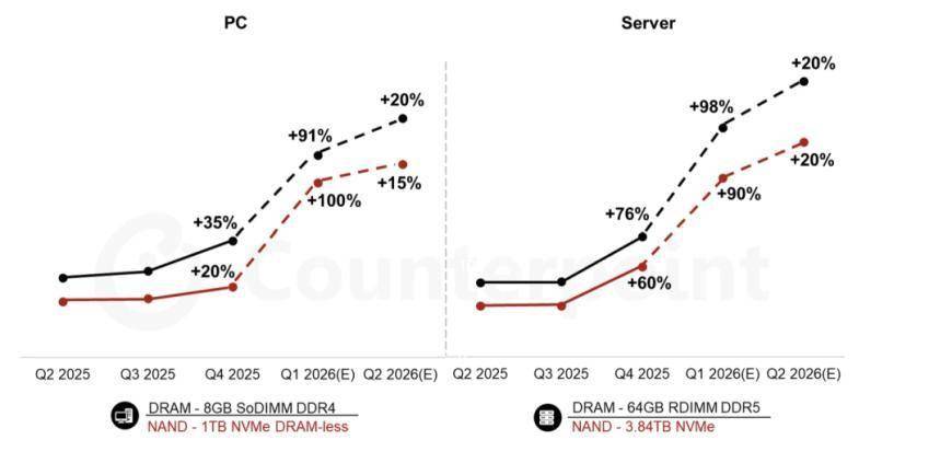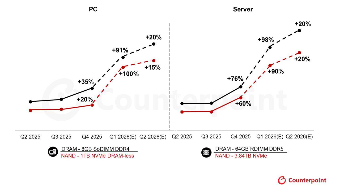 Counterpoint:当前存储器价格相较2025Q4飙升多达90%