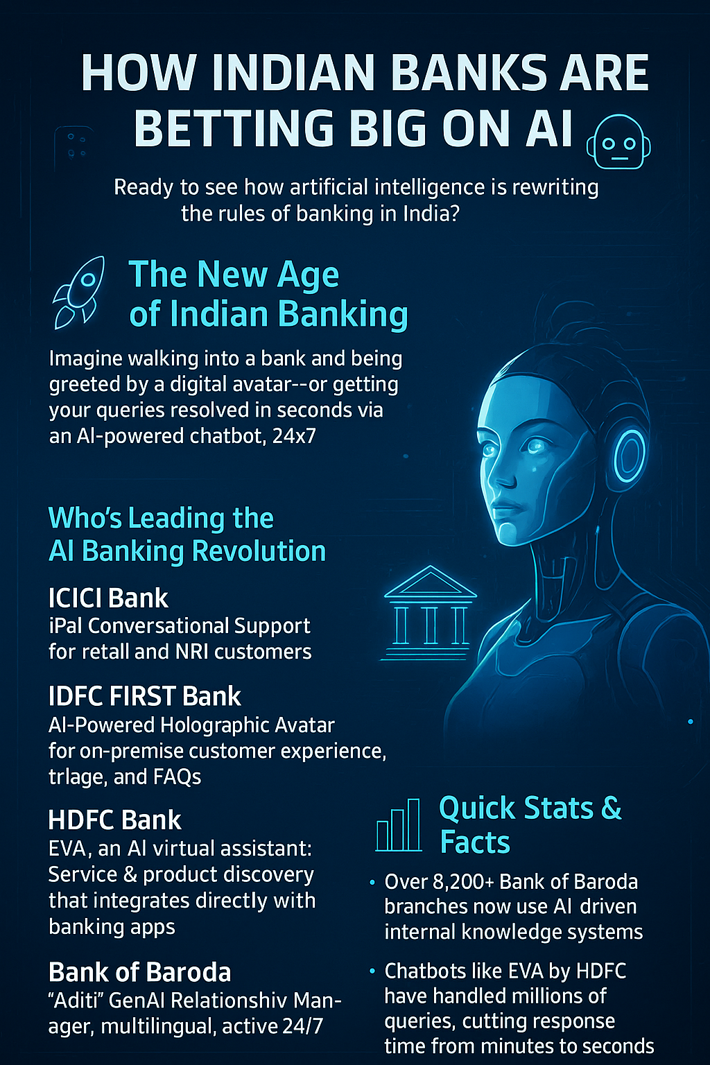 Core Insights - Indian banks are leveraging artificial intelligence (AI) to enhance customer experience, operational efficiency, and service scalability in the financial sector [1][3]. AI Implementation by Leading Banks - ICICI Bank utilizes iPal for conversational support aimed at retail and NRI customers [4]. - IDFC FIRST Bank has introduced an AI-powered holographic avatar to improve on-premise customer interactions [5]. - HDFC Bank employs EVA, an AI virtual assistant, for service and product discovery integrated with banking applications [6]. - Bank of Baroda features "Aditi," a GenAI relationship manager, providing multilingual support and operating 24/7 [7]. - SBI (State Bank of India) has revamped its YONO platform to incorporate a broader AI strategy and features [8]. - Axis Bank and IndusInd Bank offer IndusAssist, providing seamless AI service across various channels [9]. Market Context - India's banking sector serves over 1.4 billion people, managing crores of accounts and billions in daily transactions [11]. - AI technologies are essential for addressing the scale of operations, personalizing services, and ensuring 24/7 availability [11]. Performance Metrics - Over 8,200 branches of Bank of Baroda utilize AI-driven internal knowledge systems [12]. - HDFC's chatbot EVA has managed millions of queries, significantly reducing response times from minutes to seconds [12]. - The introduction of holographic avatars and multilingual support is enhancing accessibility and personalization in banking services [12].