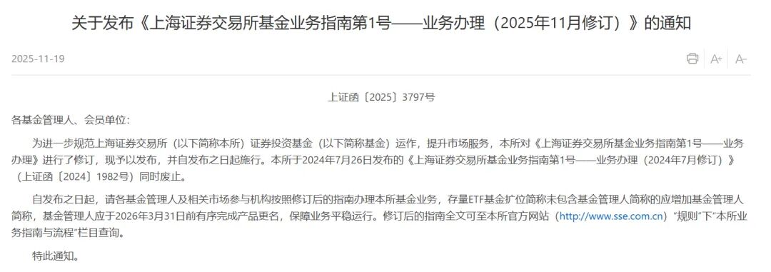 ETF(交易型开放式指数基金)命名标准化行动持续落地。 近日,沪深交易所发布修订版基金业务办理通知,对基金命名进行了规范。其中要求,ETF基金扩位简称应按照"投资标的核心要素+ETF"结构命 名,并包含基金管理人简称;存量ETF基金扩位简称必须包含基金管理人,需要在2026年3月31日之前完成产品更名。 事实上,命名规范化已成为行业共识。今年以来,易方达、华夏、嘉实、天弘、广发等多家公募机构已陆续对旗下ETF产品简称进行调整,逐步落 实"标的指数+ETF+管理人名称"的命名模式。 命名标准化 根据指南,各类产品简称需体现核心属性。其中,ETF的扩位简称必须含"ETF";LOF的扩位简称必须含"LOF",有封闭期的基金不作强制要求;FOF 的扩位简称必须含"FOF";REITs的扩位简称必须含"REIT"。为减少简称资源占用,基金短简称原则上不应包含"ETF",与扩位简称一致的除外。 指南还要求,基金扩位简称应当取自基金名称,并与实际投资标的相符、含义清晰、指向明确,不产生误导和歧义。ETF基金扩位简称应按照"投资 标的核心要素+ETF"结构命名,并包含基金管理人简称;增强ETF基金扩位简称应按照"投资标的核心 ...