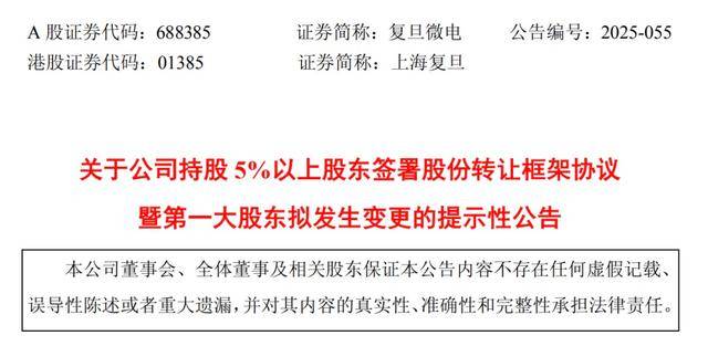 Core Viewpoint - The major shareholder of Fudan Microelectronics (688385.SH) is set to change as Shanghai Fuxin Fangao Integrated Circuit Technology Co., Ltd. plans to transfer approximately 107 million shares to Shanghai Guosheng Group Investment Co., Ltd., making Guosheng Investment the new largest shareholder with a 12.99% stake [1][4]. Shareholder Change - The actual controller of Guosheng Investment is the Shanghai State-owned Assets Supervision and Administration Commission, which will take over as the largest shareholder of Fudan Microelectronics [2]. - The share transfer is priced at 48.20 yuan per share, representing a discount of approximately 15% compared to the closing price before the agreement [4][3]. Financial Details - The total transaction value is approximately 5.144 billion yuan [3][4]. - Fudan Microelectronics has faced pressure on its performance, with a reported revenue of about 3 billion yuan for the first three quarters of 2025, a year-on-year decline of 22.69% [3][8]. Business Overview - Fudan Microelectronics specializes in the design, development, testing, and provision of system solutions for ultra-large-scale integrated circuits, being one of the earliest and first listed integrated circuit design companies in China [3][4]. - The company has invested significantly in research and development, with R&D expenses amounting to 795 million yuan in the first three quarters of 2025, accounting for 26.29% of its revenue [7][8]. Market Performance - Following the announcement of the shareholder change, Fudan Microelectronics' stock price rose to 58.60 yuan per share, reflecting a 3.33% increase [5]. - Since the beginning of 2025, the stock price has increased by approximately 53% from 38.31 yuan per share [6].