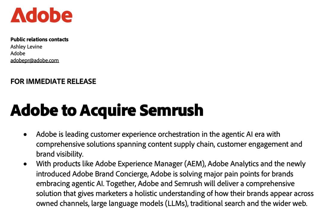 Core Insights - Adobe announced the acquisition of AI search engine marketing SaaS platform Semrush for $1.9 billion (approximately 13.5 billion RMB) [1][3] - The acquisition is expected to enhance Adobe's digital experience business by integrating Semrush's tools for tracking search and AI platform visibility [3][11] - Following the announcement, Semrush's stock surged by 70.97%, reaching a closing price of $11.76 per share, with a market capitalization of $1.754 billion (approximately 12.5 billion RMB) [3][7] Company Overview - Semrush, founded in 2008 and publicly listed in 2021, provides core tools for search engine optimization (SEO) through an online management platform [3][11] - The company has 100,000 paid users and 1 million active free registered users, with major clients including Amazon and TikTok [3][11] - Semrush reported Q3 revenue of $112.1 million (approximately 800 million RMB) and a loss of $4.5 million (approximately 32.03 million RMB) [11] Strategic Implications - Adobe aims to leverage Semrush's capabilities to help marketers enhance brand visibility in both traditional search engines and AI-driven platforms [10][13] - The acquisition aligns with Adobe's broader strategy to support brand visibility in the evolving landscape of generative AI [13] - Adobe's digital experience business president emphasized the importance of embracing generative AI to avoid losing relevance and revenue [13] Market Reaction - Adobe's stock fell by 5% following the acquisition announcement, closing at $318.11 per share, with a market capitalization of $133.16 billion (approximately 947.8 billion RMB) [7] - The acquisition is part of a trend where generative AI platforms are becoming new interfaces between brands and consumers, with a reported 1200% year-over-year increase in traffic from generative AI channels to U.S. retail websites [10][13]