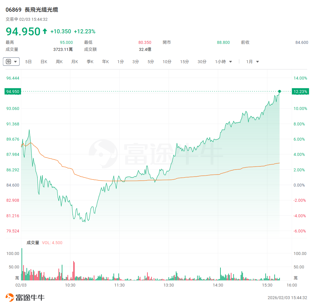 尾盘涨幅扩大,年内股价累涨超八成。截至发稿,涨12.23%,股价续刷历史新高,报94.95港元,成交额超32亿港元。 消息面上,根据机构研报,2026年1月,中国市场G.652.D单模光纤价格创下近七年来的新高,平均价格来到35元/芯公里以上。该行认为涨价主因行业供 需格局发生变化:需求端,全球AI数据中心与无人机对光纤需求高增,Meta与康宁新签60亿美金AI数据中心光缆大单供给端,供给端,光纤上游关键物 料光纤预制棒产能或无法在短期内快速提升。 国泰海通证券研报指出,光纤行业涨价趋势明确,空芯带来新的增量。近期散纤价格持续上涨,该行认为临近电信、移动运营商集采,以及春节前行业 备货需求更盛,预料价格还将持续长高。在此背景下,该行认为国内市场大客户也有望接受涨价,板块波动中得以确认。 编辑/jayden ...