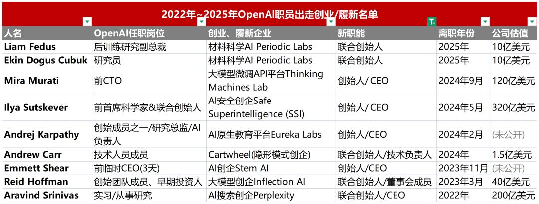 Core Insights - OpenAI is becoming a significant talent pool in the AI industry, similar to the "PayPal Mafia" in Silicon Valley, with many key members leaving to start new companies or join other firms [1][2][14] - From 2022 to 2025, 25 individuals have left OpenAI, with 9 founding 8 AI companies, collectively valued at approximately $70 billion [1][2][12] - The departure of these individuals has not diminished OpenAI's influence; instead, it has allowed its technology and organizational experience to spread across the industry [1] Talent Outflow and Company Formation - A total of 9 core members have left OpenAI to establish 8 AI companies, with a combined valuation nearing $70 billion, excluding two undisclosed valuations [2][12] - Key figures include Ilya Sutskever, who founded Safe Superintelligence (SSI) valued at $32 billion, and Mira Murati, who started Thinking Machines Lab valued at $12 billion [3][5][11] - The majority of these founders held significant positions at OpenAI, covering critical areas such as model development, training systems, and product engineering [3][12] Focus Areas of New Ventures - The new companies primarily focus on AI safety, intelligent agents, and AI applications [4][10] - SSI emphasizes "regulation as a service" for AI developers, while Thinking Machines Lab aims to create a research platform for academia and enterprises [5][9] - Other startups like Adept AI and Inflection AI focus on AI assistants and conversational agents, with significant funding secured shortly after their establishment [10][11] Market Dynamics and Valuation Trends - Companies founded by former OpenAI employees tend to achieve high valuations quickly, often without a clear product path [12][13] - For instance, SSI secured $1 billion in funding within three months of its founding, while Thinking Machines Lab raised $2 billion in its seed round [13] - This trend indicates a strong market signal where proximity to OpenAI is seen as a valuable asset for attracting investment [13] Talent Migration to Other Companies - Beyond entrepreneurship, many former OpenAI members have joined other AI firms, with at least 16 individuals moving to companies like Meta and xAI [14][16] - Meta has notably recruited a significant number of OpenAI alumni to enhance its AGI research capabilities, indicating a strategic move to leverage their expertise [16][18] - The unique organizational structure at OpenAI, which fosters a blend of research and engineering, has produced highly skilled individuals who are in demand across the industry [20][22]