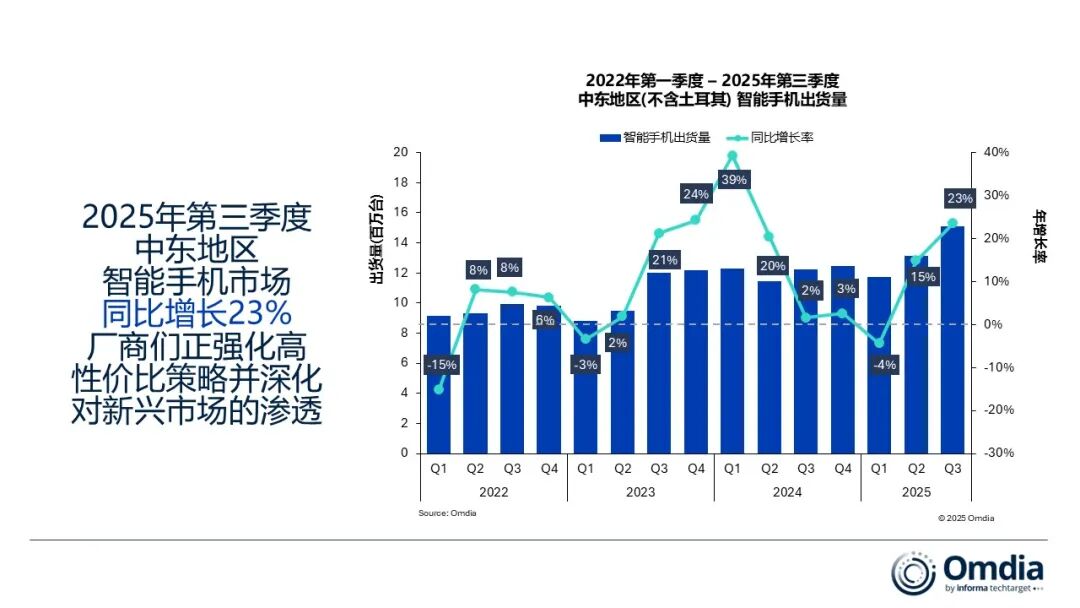 Omdia:2025年第三季度,中东智能手机市场同比增长23%,供应压力将使2026年增速放缓至1%