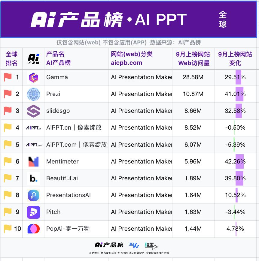 Core Insights - The AI PPT sector has seen significant growth, with Gamma achieving nearly 30 million visits and securing $68 million in Series B funding, leading to a valuation of $2.1 billion [1][5] - The top three AI PPT products experienced an average traffic increase of over 30% in September, with Mentimeter showing a remarkable 42% month-over-month growth [1][2] - The competitive landscape indicates a divergence in performance, with Gamma and AIPPT gaining traction while established players like Prezi and Slidesgo have seen declines [5][7] Company Performance - Gamma's web traffic increased from 14.53 million in September 2024 to 28.58 million in September 2025, marking a nearly 100% growth [4][5] - AIPPT's overseas site traffic rose from 1.06 million to 6.07 million, allowing it to rank among the top two in the sector when combining domestic and international traffic [5][12] - Prezi's traffic decreased from 15.68 million to 10.87 million, indicating a significant drop in user engagement [4][5] Product Features and Innovations - Gamma has introduced features such as "aspect ratio selection" and improved export capabilities, allowing users to choose between traditional 16:9 and other formats, enhancing user experience [8][10] - AIPPT's growth strategy focuses on adapting successful domestic features for international markets, with a pricing strategy that is four times lower in China compared to the U.S. [12][13] - Mentimeter, while established since 2016, has recently integrated AI features to enhance interactivity, allowing real-time audience engagement during presentations [19][22] Market Trends - The AI PPT market is characterized by a split performance, with Gamma and AIPPT thriving due to their innovative approaches, while traditional players struggle to maintain their positions [7][14] - The integration of AI in PPT creation is lowering barriers to entry, leading to increased participation in content creation and expanding the market [24] - User feedback highlights the importance of AI's ability to understand user intent and respect original content, which is crucial for gaining user trust in AI-generated outputs [14][16]