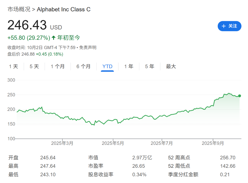 Group 1 - Alphabet's shares increased by 14% in September, driven by an antitrust ruling and new AI services, with the stock up nearly 50% over the past year [1] - An antitrust ruling allowed Alphabet to maintain its Google Chrome browser and Android operating system, which contributed to the stock's rise [2] - The launch of the "Nano Banana" image generator through the Gemini AI tool has gained significant popularity, indicating Alphabet's competitive position in consumer AI [3] Group 2 - The App Store rankings may not directly affect Alphabet's revenue but could slow the adoption of ChatGPT compared to Alphabet's products [4] - The favorable antitrust ruling and competitive landscape in AI have reduced risks for Alphabet, with the stock approaching a market cap of around $3 trillion [6] - Despite the rising stock price, Alphabet's price-to-earnings ratio (P/E) is at 26, which is lower than many AI technology competitors, highlighting its potential for growth [7]