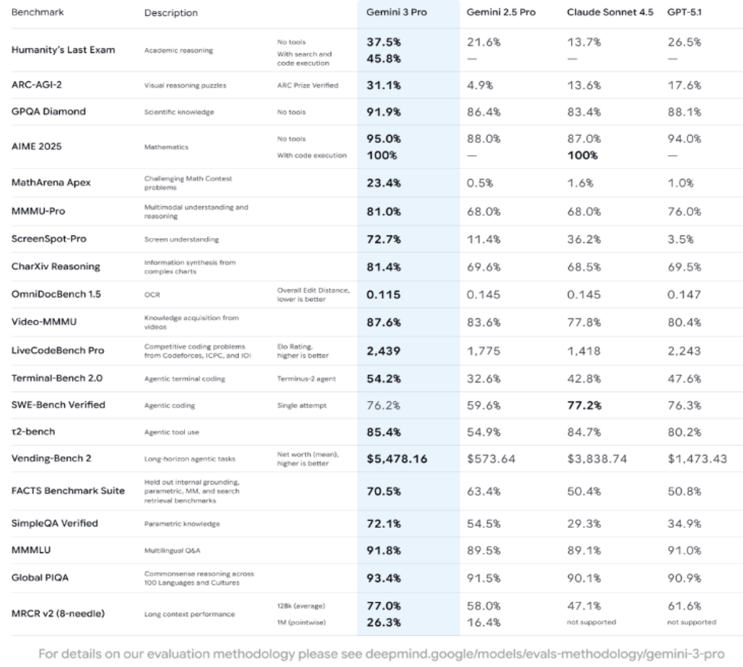 上涨因素分析 1、降息预期上升,美股持续修复。多位美联储官员近日密集发声,包括鲍威尔盟友Daly和Williams,支持在12月再次降息,认为劳动力市场面临的风险 已超过通胀,这一系列表态推动市场对美联储的宽松预期迅速升温。美联储在12月会议上降息25个基点的可能性已从一周前的约40%飙升至80%。 2、谷歌真的太强了,全栈AI超级巨头。数日前,谷歌发布Gemini3模型,Gemini3 Pro刷新了几乎所有榜单,是目前综合实力最强,且数学推理、视频生 成、代码等单项能力大幅领先的大模型。 来源:市场资讯 (来源:ETF和LOF圈) 今日市场冲高回落,沪深两市成交额1.78万亿,较上一个交易日缩量288亿。截至收盘,沪指跌0.15%,深成指涨1.02%,创业板指涨2.14%。通信ETF强 势,盘中一度冲高至接近8%,收涨5.61%。创业板人工智能ETF收涨4.89%。 资料来源:wind | Benchmark | Description | | Gemini 3 Pro | Gemini 2.5 Pro | Claude Sonnet 4.5 | GPT-5.1 | | --- | --- | --- | ...