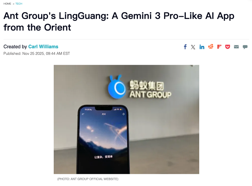 Core Insights - Ant Group's multimodal AI assistant "Lingguang" launched on November 18, quickly gaining attention both domestically and internationally, with Tech Times highlighting its ease of problem-solving [1][3] - Within just six days of its release, Lingguang achieved over 2 million downloads, indicating strong market interest and adoption [3] - Lingguang is compared to Google's Gemini 3 Pro, showcasing similar functionalities, including the ability to integrate language, images, sound, and data into engaging outputs [3] Group 1 - Lingguang's core functionality revolves around breaking down tasks into manageable components and switching between different modes to present clear and logical results [3] - Ant Group's CTO described Lingguang as akin to having a personal AI developer in one's pocket, facilitating coding, visualization, and simplification of complex issues [3] - The rapid iteration speed of technology companies like Ant Group suggests that improvements to Lingguang will be forthcoming [3] Group 2 - Prior to Lingguang's launch, other Chinese AI models had already outperformed Western counterparts in an AI investment competition, indicating China's competitive edge in AI innovation [4] - Lingguang's emergence has attracted attention from major international media, with Business Insider noting its capabilities in "ambient programming" and application development [4] - IT Boltwise emphasized that Lingguang's application development features represent a significant advancement in AI, potentially transforming how applications are created [4] Group 3 - On overseas social media, Lingguang's multimodal delivery capabilities received positive feedback from professional users, with comments highlighting its impressive integration of search, reasoning, and creativity [6] - Users noted that the code-driven outputs meet developers' needs, suggesting that multimodal AI is becoming increasingly engaging and practical [6]