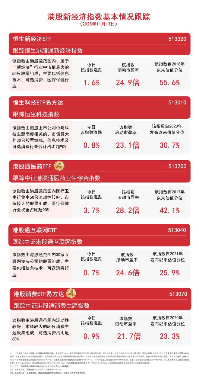 截至收盘,中证港股通互联网指数上涨0.7%,恒生科技指数上涨0.8%,中证港股通消费主题指数上涨 0.9%,恒生港股通新经济指数上涨1.6%,中证港股通医药卫生综合指数上涨3.7%。 互联网大厂方面今日迎来多重利好,百度文库、百度网盘正式发布GenFlow3.0,活跃用户超2000万,成 为"全球最大通用智能体",该智能体具有更强大的通用化多模态能力,可以实现全模态内容的输入、处 理和输出;腾讯发布2025年第三季度财报,当季实现营业收入1928.7亿元,同比增长15%,经营利润 (Non-IFRS)达725.7亿元,同比增长18%,延续高质量收入增长。 25. 970 | 港股消费ETF易方达 2 | | | 513070 | | --- | --- | --- | --- | | 跟踪中证港股通消费主题指数 | | | | | 该指数由港股通范围内流动性 | 今日 | 该指数 | 该指数自2020年 | | 较好、市值较大的50只消费主 | 该指数涨跌 | 滚动市盈率 | 发布以来估值分位 | | 题股票组成,可选消费占比近 | 0.9% | 21.7倍 | 23. 3% | | 60% | | | | ...