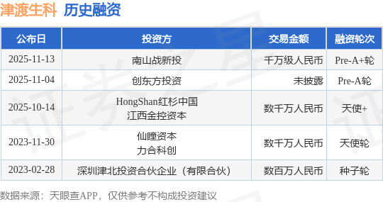 | 公布日 | 投资方 | 交易金额 | 融资轮次 | | --- | --- | --- | --- | | 2025-11-13 | 南山战新投 | 千万级人民币 | Pre-A+轮 | | 2025-11-04 | 创东方投资 | 未披露 | Pre-A轮 | | 2025-10-14 | HongShan红杉中国 | 数千万人民币 | 天使+ | | | 江西全控资本 | | | | 2023-11-30 | 仙瞳资本 | 数千万人民币 | 天使轮 | | | 力合科创 | | | | 2023-02-28 | 深圳津北投资合伙企业(有限合伙) | 数百万人民币 | 种子轮 | 证券之星消息,根据天眼查APP于11月13日公布的信息整理,深圳津渡生物医学科技有限公司Pre-A+轮 融资,融资额千万级人民币,参与投资的机构包括南山战新投。 数据来源:天眼查APP 以上内容为证券之星据公开信息整理,由AI算法生成(网信算备310104345710301240019号),不构成 投资建议。 津渡生科(OxTium Technology)致力于开发多模态医学诊断大模型,主要聚焦多组学分析(RNA组、 DNA组 ...