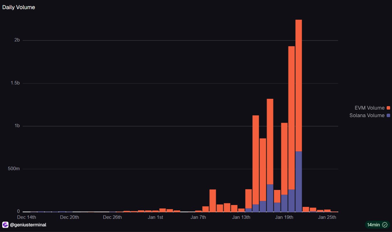 Genius Terminal 日交易量自 1 月 21 日达到 22 亿美元峰值后遭遇断崖式下滑