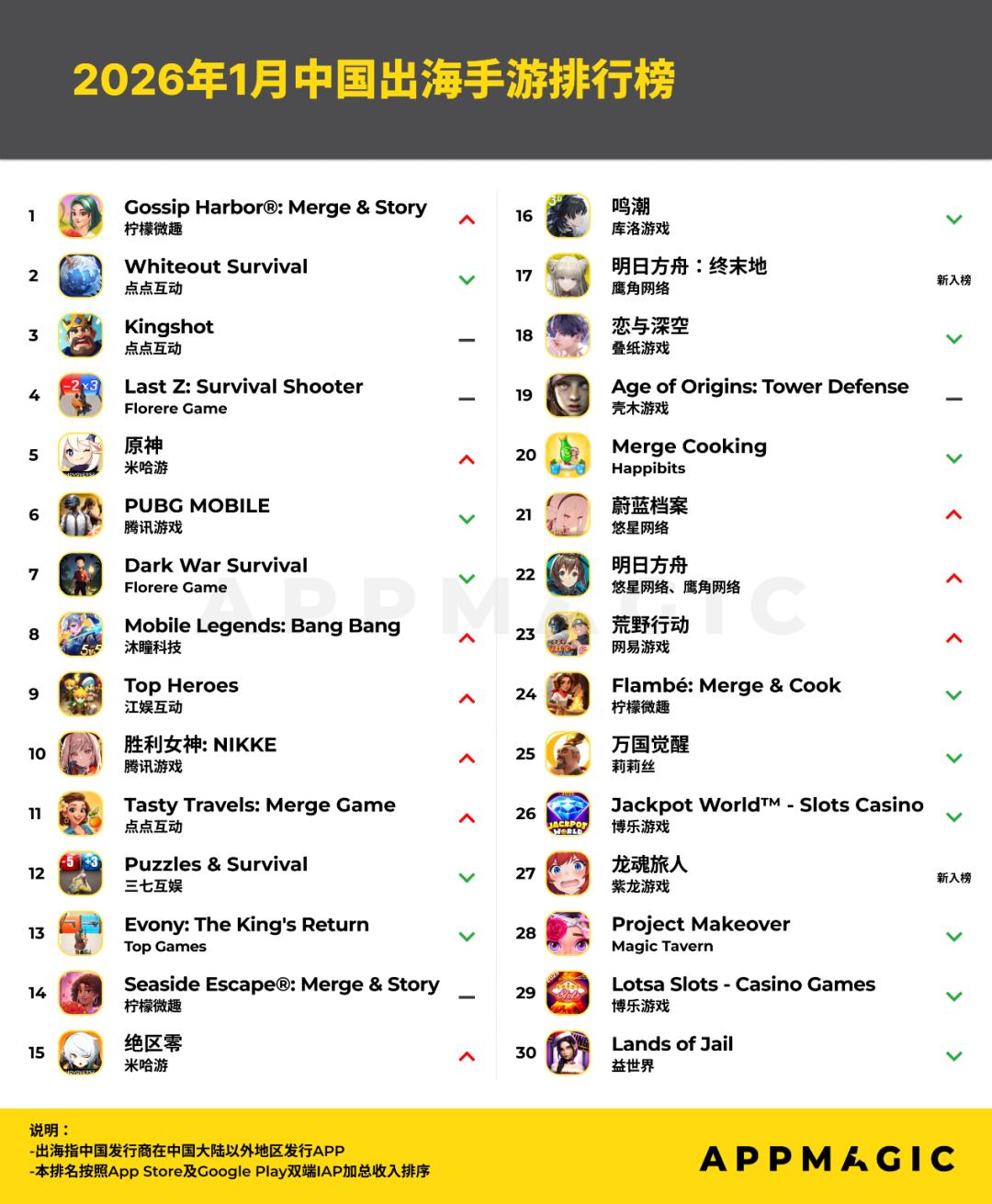 合成,无疑是 2025 年最热的出海词汇之一,与之相关的关键词,还有柠檬微趣、不断抬高的月流水、北京厂商等等。 而进入 2026 年,合成品类在一开年又刷新了成绩。AppMagic 最新公布的数据显示,柠檬微趣旗下的「Gossip Harbor」已经凭借超过 7900 万美元的分成 后收入登顶 1 月出海手游收入榜,超越了一众 SLG 产品。 | | Gossip Harbor®: Merge & Story | | 16 | 鸣潮 | | | --- | --- | --- | --- | --- | --- | | | 柠檬微趣 | | | 库洛游戏 | | | 2 | Whiteout Survival | | 17 | 明日方舟:终末地 | | | | 点点互动 | > | | 鹰角网络 | 新入榜 | | 3 | Kingshot | | 18 | 恋与深空 | | | | 点点互动 | | | 叠纸游戏 | | | 4 | Last Z: Survival Shooter | | 18 | Age of Origins: Tower Defense | | | | Florere Game | | ...
