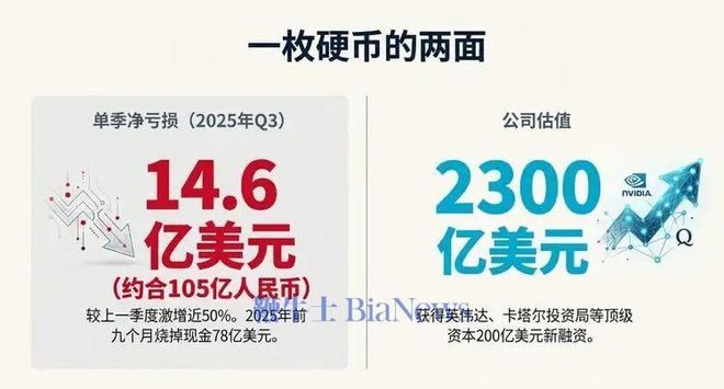 来源:网易科技 3个月,马斯克这家公司亏了105亿人民币。 据彭博社刚刚曝光的内部文件显示,马斯克的xAI在2025年第三季度交出了一份极其"惨烈"的成绩单: 单季净亏损14.6亿美元(约合人民币105亿元)。 这个数字比上一季度激增了近50%。今年前九个月,这家成立不久的公司已经烧掉了整整78亿美元现 金。换做其他独角兽,这种失血速度足以让它瞬间休克,甚至直接被投资人切断输血,原地宣告破产。 但这恰恰是马斯克商业帝国的魔幻之处:就在亏损狂飙的同时,xAI的估值却一路冲到了2300亿美元。 英伟达和卡塔尔投资局等顶级资本,非但没有被吓跑,反而争先恐后地送来了200亿美元的新融资。 (图片由AI生成) 华尔街似乎达成了某种默契:他们不只看利润表上的数字,而是死死盯着马斯克正在荒野中拔地而起的 那些超级算力集群。 在投资人眼里,当野心大到想要构建前所未有的算力怪兽时,账面上的巨额亏损就不再是黑洞,而是通 往AGI(通用人工智能)不得不付出的"门票"。 如果你觉得特斯拉当年烧钱快,那xAI可能会刷新你的认知。 根据内部财务文件,仅2025年6月到9月,xAI的净亏损就高达14.6亿美元,而前一季度这个数字是10亿 ...
