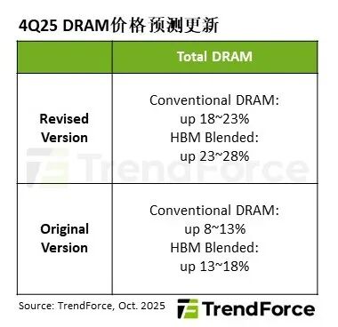 DRAM供应吃紧推高DDR5合约价,2026年获利有望超越HBM3e 根据Tr endFor c e集邦咨询最新调查,2025年第四季Se rve r DRAM合约价受惠于全球云端供应商 (CSP)扩充数据中心规模,涨势转强,并带动整体DRAM价格上扬。尽管第四季DRAM合约价 尚未完整开出,供应商先前收到CSP加单需求后,调升报价的意愿明显提高。 TrendForc e集邦 咨询据此调整第四季一般型(Conventional DRAM)价格预估,涨幅从先前的8-13%,上修至 18-23%,并且很有可能再度上修。 | | Total DRAM | | --- | --- | | | Conventional DRAM: | | Revised | up 18~23% | | Version | HBM Blended: | | | up 23"28% | | | Conventional DRAM: | | Original | up 8~13% | | Version | HBM Blended: | | | up 13~18% | | | Source: TrendForce, Oct. 2025 Tr ...
