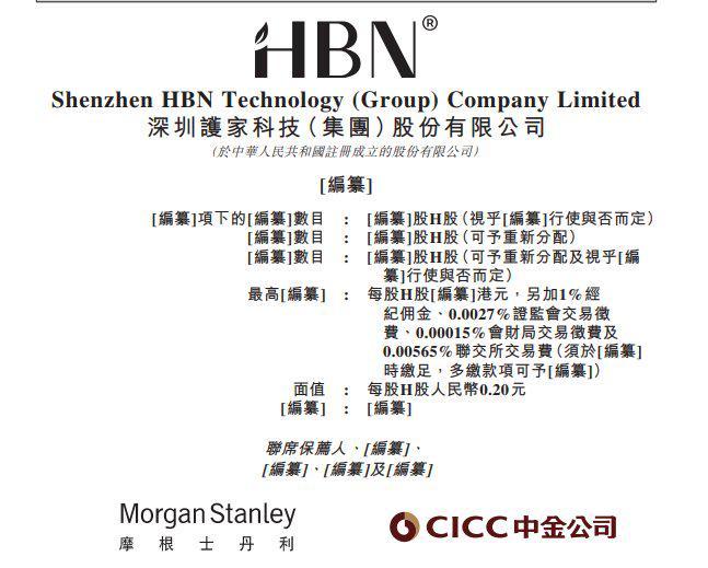 (於中華人民共和國註冊成立的股份有限公司) [编纂] [編纂]項下的[編纂]數目 : [編纂]股H股(視乎[編纂]行使與否而定) [編纂]數目 [編纂]股H股(可予重新分配) :: [編纂]數目 [編纂]股H股(可予重新分配及視乎[編 : 纂]行使與否而定) 最高[編纂] : 每股H股[編纂]港元,另加1%經 紀佣金 · 0.0027%證監會交易徵 費 · 0.00015% 會財局交易徵費及 0.00565%聯交所交易費(須於[編纂] 時繳足,多繳款項可予[編纂]) 面值 : 每股H股人民幣0.20元 [糟플] [贈養] : 聯席保薦人·[編纂]· [編纂]·[編纂]及[編纂] 据港交所1月26日披露,深圳护家科技(集团)股份有限公司(简称:护家科技)向港交所主板递交上市申请 书,摩根士丹利、中金公司(601995)为其联席保荐人。据招股书,护家科技是中国领先的皮肤学级护 肤品牌,亦在改善型护肤品市场中位居前列。2019年,HBN品牌为看得见的真功效而生,"让真功效名 副其实",满足消费者对具科学实证护肤效果的目益增长需求。 (R) Shenzhen HBN Technology (Group) Compan ...