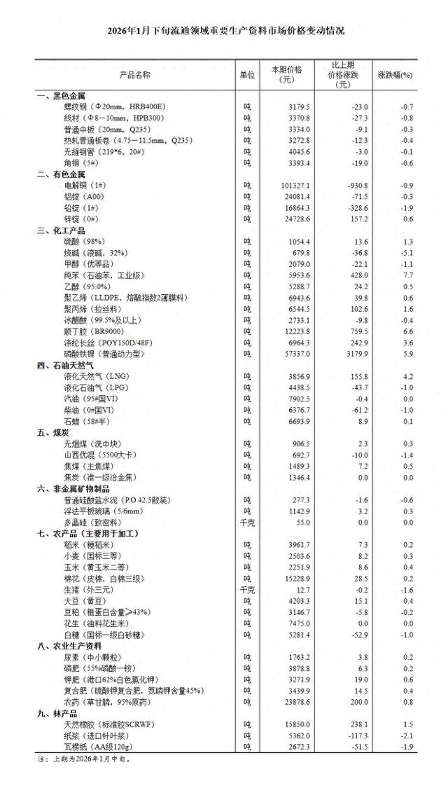 Core Viewpoint - The National Bureau of Statistics of China reported on February 4, 2026, that the prices of important production materials in circulation showed mixed trends in late January compared to mid-January, with 25 products increasing in price, 21 decreasing, and 4 remaining stable [1]. Group 1: Price Changes in Major Categories - In the black metal category, prices for rebar decreased by 0.7% to 31,795 yuan per ton, while wire rod fell by 0.8% to 3,370.8 yuan per ton [2]. - In the non-ferrous metals category, electrolytic copper saw a price increase of 0.9% to 101,327.1 yuan per ton, while aluminum ingots decreased by 0.3% to 24,081.4 yuan per ton [2]. - Chemical products experienced varied price movements, with sulfuric acid increasing by 1.3% to 1,054.4 yuan per ton, while caustic soda decreased by 5.1% to 679.8 yuan per ton [2]. Group 2: Agricultural Products - Among agricultural products, the price of rice rose by 0.2% to 3,961.7 yuan per ton, while the price of live pigs (external three yuan) decreased by 1.6% to 12.7 yuan per kilogram [2][3]. - Wheat prices increased by 0.3% to 2,503.6 yuan per ton, and corn prices rose by 0.4% to 2,251.9 yuan per ton [3]. Group 3: Energy Products - In the petroleum and natural gas sector, liquefied natural gas (LNG) prices increased by 4.2% to 38,569 yuan per ton, while liquefied petroleum gas (LPG) prices decreased by 1.0% to 4,438.5 yuan per ton [2][3]. - Gasoline prices remained stable at 7,902.5 yuan per ton, while diesel prices fell by 1.0% to 6,376.7 yuan per ton [2]. Group 4: Fertilizers and Pesticides - Fertilizer prices showed an upward trend, with diammonium phosphate increasing by 0.2% to 3,878.8 yuan per ton, and potassium chloride rising by 0.6% to 3,271.9 yuan per ton [3][5]. - Pesticide prices also increased, with glyphosate rising by 0.8% to 23,878.6 yuan per ton [3]. Group 5: Wood and Paper Products - In the forestry products category, natural rubber prices increased by 1.5% to 15,850.0 yuan per ton, while pulp prices decreased by 2.1% to 5,362.0 yuan per ton [3][5]. - The price of corrugated paper fell by 1.9% to 2,672.3 yuan per ton [5].