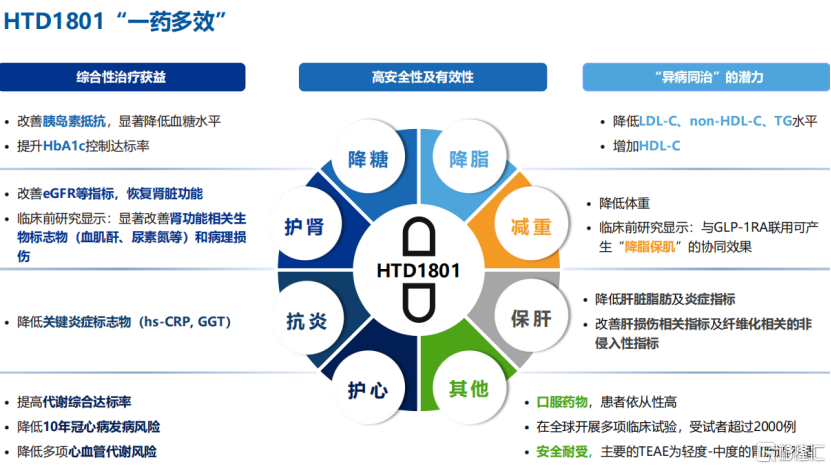 Core Viewpoint - The commercialization process of the core product HTD1801 is expected to accelerate within the year, with positive Phase III trial data for treating type 2 diabetes, showcasing significant differentiation and multi-effect advantages [1][2]. Product Development - HTD1801 has successfully completed two Phase III clinical trials for type 2 diabetes patients in China, with data readouts completed and a head-to-head trial against Dapagliflozin expected to be announced by December 2025 [2]. - The product is in the final sprint of development and is anticipated to enter the New Drug Application (NDA) stage by the end of 2025 [2]. Product Features and Market Potential - HTD1801 is a globally innovative oral anti-inflammatory and metabolic modulator, granted two Fast Track designations by the FDA, and operates through a unique dual mechanism that activates AMPK and inhibits NLRP3 [3]. - The product shows broad efficacy in improving blood glucose metabolism, kidney protection, heart protection, liver protection, anti-inflammation, and weight loss, distinguishing it from other diabetes treatments [3]. - There is a significant unmet clinical need in the treatment of cardio-renal metabolic (CKM) diseases, and HTD1801 has the potential to become a cornerstone therapy in this area, indicating a vast market opportunity [3]. Clinical Trial Results - Phase III clinical data indicates that HTD1801 can significantly and clinically meaningfully reduce HbA1c levels by -1.1% to -1.3%, effectively lowering fasting and postprandial blood glucose levels and improving insulin resistance [4]. - HTD1801 demonstrates superior HbA1c reduction compared to Dapagliflozin, with a higher proportion of patients achieving HbA1c < 7% [4]. - The product also shows significant improvements in cardiovascular metabolic indicators such as LDL-C and non-HDL-C compared to Dapagliflozin, highlighting its competitive advantages [4]. Chronic Kidney Disease (CKD) Application - HTD1801 has shown potential in improving eGFR levels in chronic kidney disease (CKD) treatment, with clinical data indicating its ability to improve eGFR changes in early-stage patients [5]. - In patients with mild renal impairment, HTD1801 significantly improved eGFR compared to placebo, suggesting its potential for restoring kidney function [5].