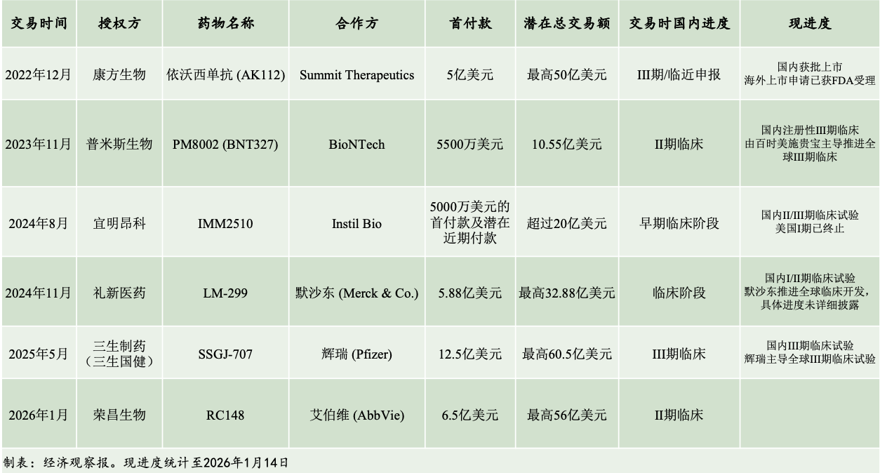 Core Insights - The announcement of a $5.6 billion licensing agreement between Rongchang Biopharma and AbbVie marks a significant milestone for Chinese innovative drugs entering the global market, indicating a shift from follower to leader in the dual antibody space [1][3] - Concurrently, Kangfang Biopharma's partner, Summit Therapeutics, submitted a Biologics License Application (BLA) for Ivoris monoclonal antibody to the FDA, further highlighting the progress of Chinese dual antibodies on the international stage [1][4] - However, the termination of a licensing agreement by Yiming Oncology with Instil Bio serves as a cautionary tale for the challenges faced by Chinese companies in global expansion [1][10] Group 1: Major Developments - Rongchang Biopharma's agreement with AbbVie includes an upfront payment of $650 million and potential milestone payments of up to $4.95 billion, along with double-digit royalties on net sales outside Greater China [3] - Kangfang Biopharma's Ivoris monoclonal antibody is positioned to address a significant unmet clinical need in treating EGFR-mutant non-small cell lung cancer, with the FDA expected to make a decision by Q4 2026 [4][5] - The competitive landscape for PD-1/VEGF dual antibodies is intensifying, with major pharmaceutical companies increasingly focusing on a few validated "winners" in the market [2][9] Group 2: Industry Trends - The recent high-value transactions in the dual antibody space reflect a growing recognition of the clinical and commercial potential of Chinese innovative drugs, with transaction amounts reaching new heights [9] - The competitive dynamics are shifting, as the number of potential international buyers decreases due to the concentration of capital and interest in a limited number of validated products [10][13] - The success of PD-1/VEGF dual antibodies is seen as pivotal for the future of cancer treatment, with ongoing clinical trials exploring their combination with other therapies to enhance efficacy [14]