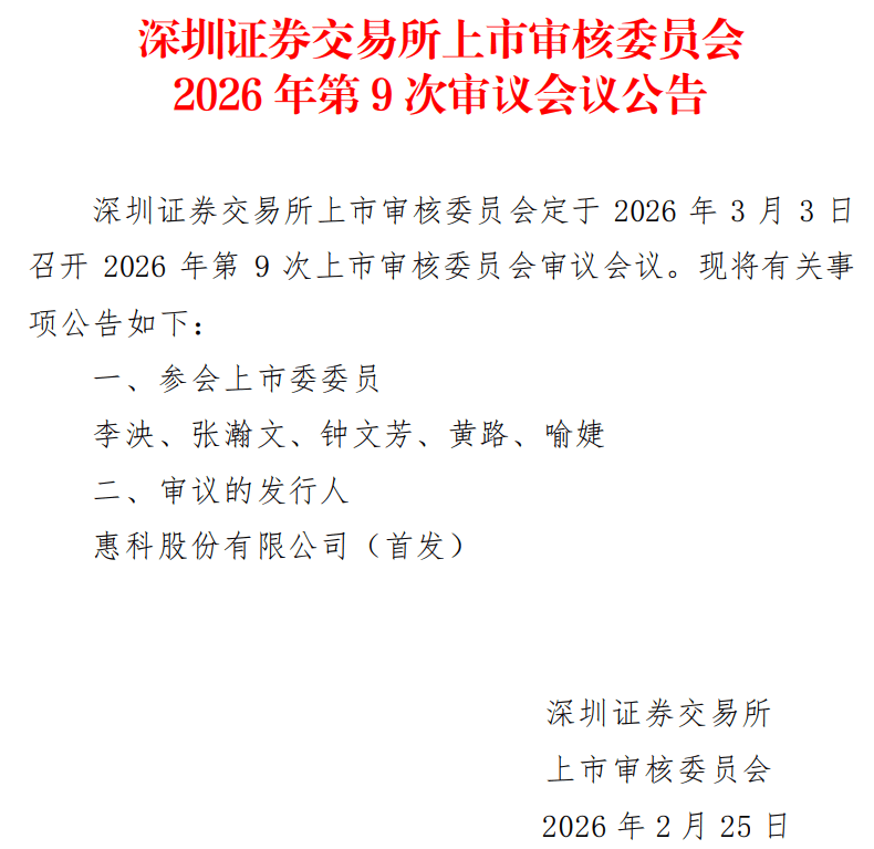 来源:市场资讯 (来源:IPO上市实务) 深圳证券交易所上市审核委员会定于2026年3月3日召开2026年第9次上市审核委员会审议会议,审核惠科股份有限公司 (首发)。 | 公司全称 | 惠科股份有限公司 | | --- | --- | | 受理日期 | 2025-06-30 | | 审核状态 | 已问询 | | 保存机构 | 中国国际金融股份有限公司 | | 会计师事务所 | 天健会计师事务所(特殊普通合伙) | | 律师事务所 | 北京市君合律师事务所 | | 评估机构 | 北方亚事资产评估有限责任公司 | 惠科股份有限公司("惠科股份")是一家专注于半导体显示领域的中国领先、世界知名的科技公司,主营业务为半导体显 示面板等核心显示器件以及智能显示终端的研发、制造和销售,主要产品包括多种尺寸和类型的TV面板、IT面板、TV终 端、IT终端以及各类智慧物联终端,广泛应用于消费电子、商用显示、汽车电子、工业控制、智慧物联等显示场景。 通过本次首次公开发行股票并上市,公司将进一步巩固在半导体显示领域的竞争优势,提升全球品牌影响力;加大 OLED、Oxide、MiniLED等新型显示技术研发投入和产线布局,提升现 ...