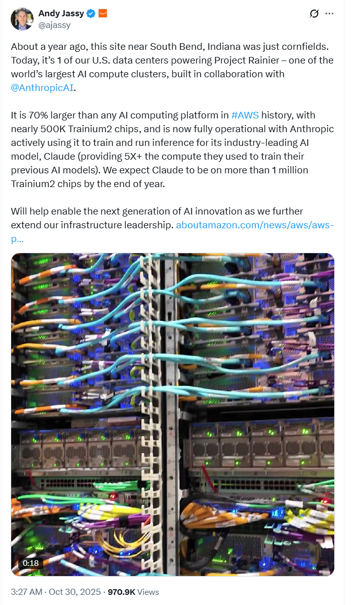 随着旗下核心数据中心正式运行,亚马逊AI基础设施布局迎来关键里程碑。 就在几天前,亚马逊首席执行官安迪·贾西(Andy Jassy)在社交平台X上宣布: 公司位于美国印第安纳州南本德附近的一片玉米地,如今已经成为全球最大AI计算集群之一——Project Rainier的核心数据中心。这一由AWS与 AI独角兽Anthropic共同打造的系统,部署了近50万颗Trainium2自研芯片,规模比AWS历史上任何AI平台都大出70%,目前已全面投入运行。 据贾西透露,公司合作伙伴Anthropic正在利用该系统训练和运行其大模型Claude,提供了比其此前训练AI模型多5倍以上的计算能力。预计到年 底,该系统的Trainium2芯片部署数量翻番至100万颗。 这意味着亚马逊的AI基础设施扩张正从战略布局转向产能兑现,成为其AI业务发展的重要转折点。 摩根士丹利预计,AWS未来两年收入增速将分别达到23%与25%,而据美银预测,仅Anthropic就可能在2026年为AWS带来高达60亿美元的增量 收入。 亚马逊AI战略的核心,不是模型,而是"算力底座"——也就是自研芯片体系:Trainium系列(专用于AI训练) ...