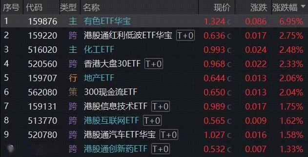 1月28日,A股三大指数表现分化,沪指再次走出"W"态势收涨0.27%,创业板指跌0.57%。行情逻辑围 绕"涨价"主线展开,资源品全线走强,有色领涨两市。全市场超3600只个股下跌,两市成交额2.97万亿 元。 | 序号 代码 | | 类型 名称 | 现价 | | 涨跌 涨跌幅 ▼ | | --- | --- | --- | --- | --- | --- | | 1 | 159876 | 主 有色ETF华宝 | 1.324 c | 0.086 | 6.95% | | 2 | 159220 | 跨 港股通红利低波ETF华宝 T+0 | 0.636 c | 0.017 | 2.75% | | 3 | 516020 | 主 化工ETF | 0.993 c | 0.024 | 2.48% | | 4 | 520560 | 跨 香港大盘30ETF T+0 | 0.968 c | 0.022 | 2.33% | | 5 | 159707 | 行 地产ETF | 0.644 c | 0.013 | 2.06% | | 6 | 562080 | 策 300现金流ETF | 0.650 c | 0.013 | 2.04% ...