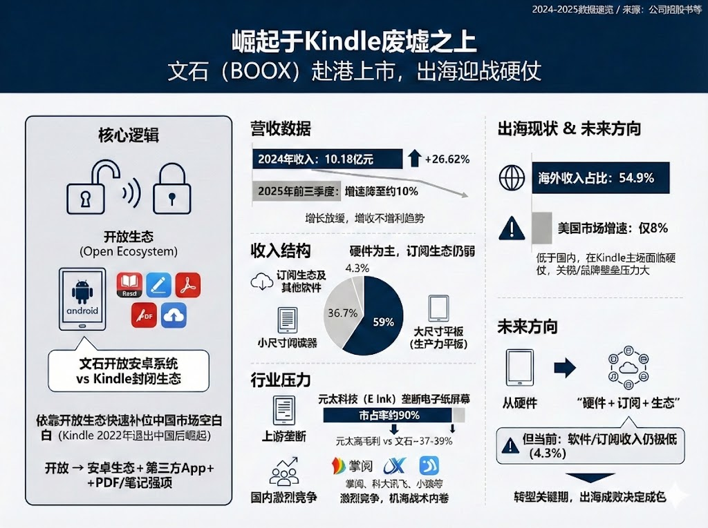 在Kindle宣布退出中国市场3年多后,一家来自广州的"幸存者"正向资本市场证明,墨水屏这门生意不仅没死,还能做成一家有望上市的公司。 近日,广州文石信息科技股份有限公司(下称"文石")向港交所递交招股书。 拆解文石的商业逻辑可以用"反Kindle"来形容。 不同于亚马逊试图通过"低价硬件+卖书回血"的封闭系统模式,文石的墨水屏产品主打开放系统,用户可以在应用商店中自由下载微信读书等各类 APP。 但光鲜的数据背后,亦有隐忧。 在Kindle离场的废墟之上,文石虽然捡漏了用户,却也不得不直面硬件制造"苦生意"的挑战:竞对的"机海战术"、上游巨头掣肘。 为了追上掌阅等厂商的上新速度,2024年、2025年文石分别发布了13款、9款新品,如此上新速度堪比国内主流手机厂商。 即便如此,2025年前三季度文石的收入同比增速仍仅为10%左右,落后于2024年全年的增速。 如今,文石正在开拓海外市场,要在Kindle的主场美国市场进行"真枪实弹"比拼,开放性系统思路能否在海外市场走通,正受到关注。 巨头与竞对的双重挤压 亚马逊旗下的水墨屏阅读器Kindle败走中国市场的往事还历历在目,其核心在于"剃刀与刀片"商业模式在中 ...