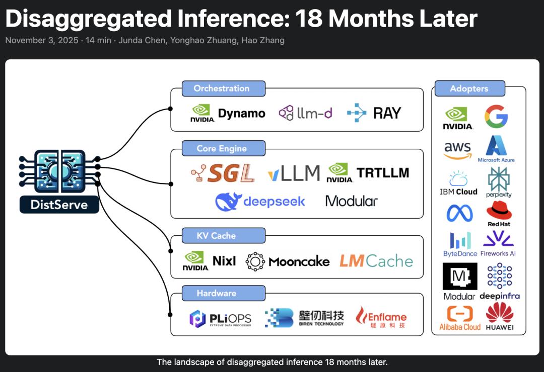 2024年,北京大学金鑫-刘譞哲团队、加州大学圣地亚哥分校「Hao AI Lab」等提出了DistServe解耦推理理念,短短一年多时间,迅速从实验 室概念成长为行业标准,被NVIDIA、vLLM等主流大模型推理框架采用,预示着AI正迈向「模块化智能」的新时代。 如果说「摩尔定律」认为计算能力每18个月翻倍,如今大模型推理成本的下降速度,已远超「摩尔定律」关于计算能力迭代速度的预测。 这并非只是芯片性能提升之功,更重要的是来自推理系统的自身进化。而加速这一进化的,源自一个在DistServe系统中首次提出并实践的「解耦推理」理 念。 该系统由北大、UCSD等机构于2024年3月推出,并提出了一个简单而大胆的设想: 将大模型的推理过程拆分为「预填充」和「解码」两个阶段,并让它们分别在独立的计算资源池中进行伸缩与调度。 如今,这种解耦推理架构已被NVIDIA、llm-d、vLLM、MoonCake等主流大模型推理框架采用,并开始在大规模、真实推理场景中发挥强大力量。 「Hao AI Lab」由加州大学圣地亚哥分校助理教授Hao Zhang领导,他也是2025年谷歌机器学习与系统青年教师奖的获得者。 「Hao AI ...