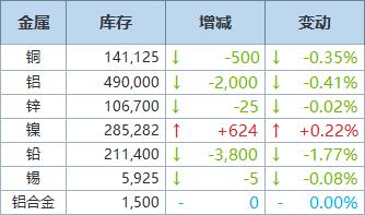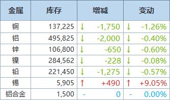 》查看更多金属库存信息 | 地点 | 前日库存 | | 入库 出库 | 今日库存 | 变动 | 注册仓单 | 注销仓单 | 注销占比 | | --- | --- | --- | --- | --- | --- | --- | --- | --- | | 铜 | 141625 | 200 | 700 | 141125 | -500 | 91025 | 50100 | 35.50% | | 昌雄 | 75450 | 0 | 700 | 74750 | -700 | 46750 | 28000 | 37.46% | | 光阳 | 22600 | 200 | 0 | 22800 | +200 | 7175 | 15625 | 68.53% | | हैं। | 13300 | 0 | 0 | 13300 | 0 | 9125 | 4175 | 31.39% | | 農特丹 | 10775 | 0 | 0 | 10775 | 0 | 9775 | 1000 | 9.28% | | 中国青港 | 9400 | 0 | 0 | 9400 | 0 | 9400 | 0 | 0.00% | | 新加坡 | 6875 | 0 | ...