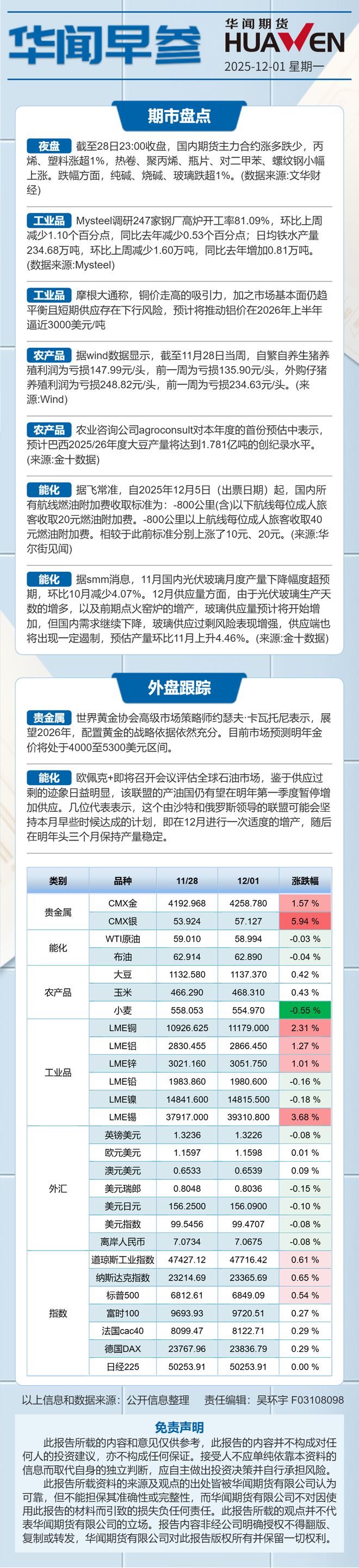 (来源:华闻期货) 来源:华闻期货 外盘眼踪 贵金属 世界黄金协会高级市场策略师约瑟夫·卡瓦托尼表示,展 望2026年,配置黄金的战略依据依然充分。目前市场预测明年金 价将处于4000至5300美元区间。 欧佩克+即将召开会议评估全球石油市场,鉴于供应过 能化 剩的迹象日益明显,该联盟的产油国仍有望在明年第一季度暂停增 加供应。几位代表表示,这个由沙特和俄罗斯领导的联盟可能会坚 持本月早些时候达成的计划,即在12月进行一次适度的增产,随后 在明年头三个月保持产量稳定。 | 类别 | 品种 | 11/28 | 12/01 | 涨跌幅 | | --- | --- | --- | --- | --- | | 贵金属 | CMX | 4192.968 | 4258.780 | 1.57 % | | | CMX铝 | 53.924 | 57.127 | 5.94 % | | 能化 | WTI原油 | 59.010 | 58.994 | -0.03 % | | | 布油 | 62.914 | 62.890 | -0.04 % | | 农产品 | 大豆 | 1132.580 | 1137.370 | 0.42 % | | ...