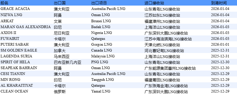 从进口来源国看,2025年12月29日-2026年1月4日当周,中国LNG进口来源国有10个。其中,自澳大利亚进口3 船,进口量约18万吨,约占当周进口总量的18%。 从到货地看,2025年12月29日-2026年1月4日当周,华南地区共接卸6船LNG,长三角地区接卸4船,环渤海地区接 卸5船。其中,山东青岛LNG接收站到港3船,共计约22万吨,数量最多。 新华财经北京1月5日电中国天然气信息终端(E-Gas系统)发布的实时LNG进口到船数据显示,2025年12月29 日-2026年1月4日当周,预估中国通过沿海LNG接收站进口LNG共计15船,进口量约98万吨,前值为175万吨。 表1:2025年12月29日-2026年1月4日中国LNG进口分析 | 船名 | 出口国 | 出口项目 | 进圆接收站 | 到港时间 | | --- | --- | --- | --- | --- | | GRACE ACACIA | 澳大利亚 | Australia Pacifc LNG | 山东青岛LNG接收站 | 2026-01-04 | | NIZWA LNG | 阿盖 | Oman LNG | 江苏如东LNG接收站 | ...